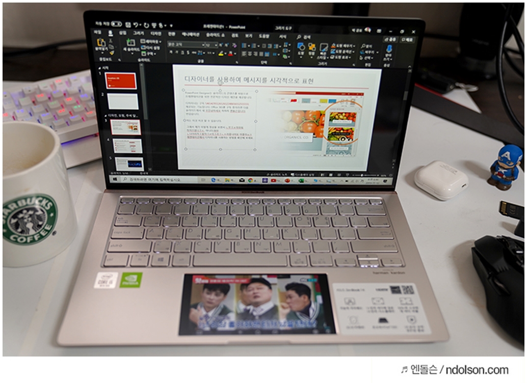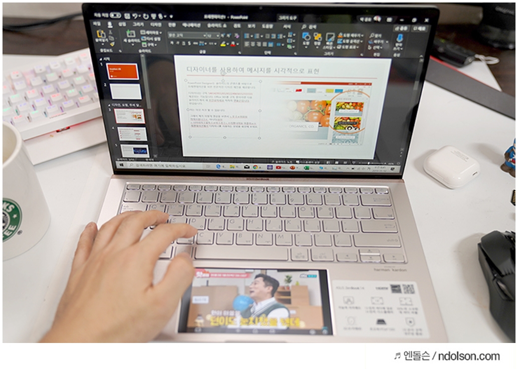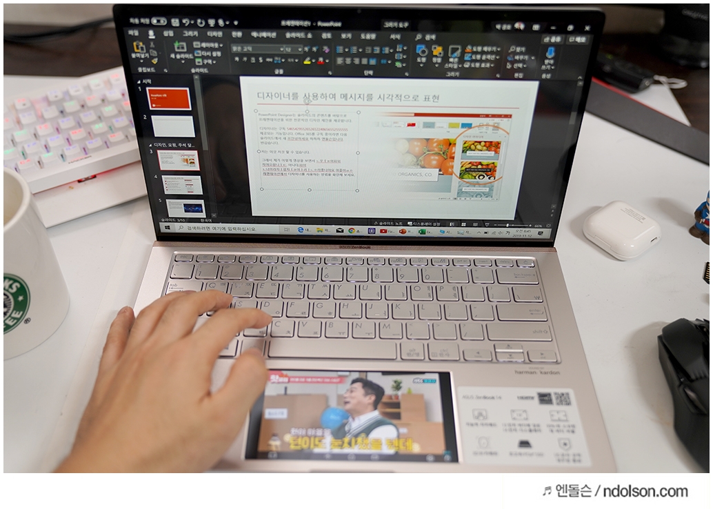 파워포인트를 쓰면서 아는 형님 예능 프로그램을 보고 있습니다. 키보드를 주로 사용하기 때문에 트랙패드에 나오는 동영상을 보기가 더욱 편리했습니다.