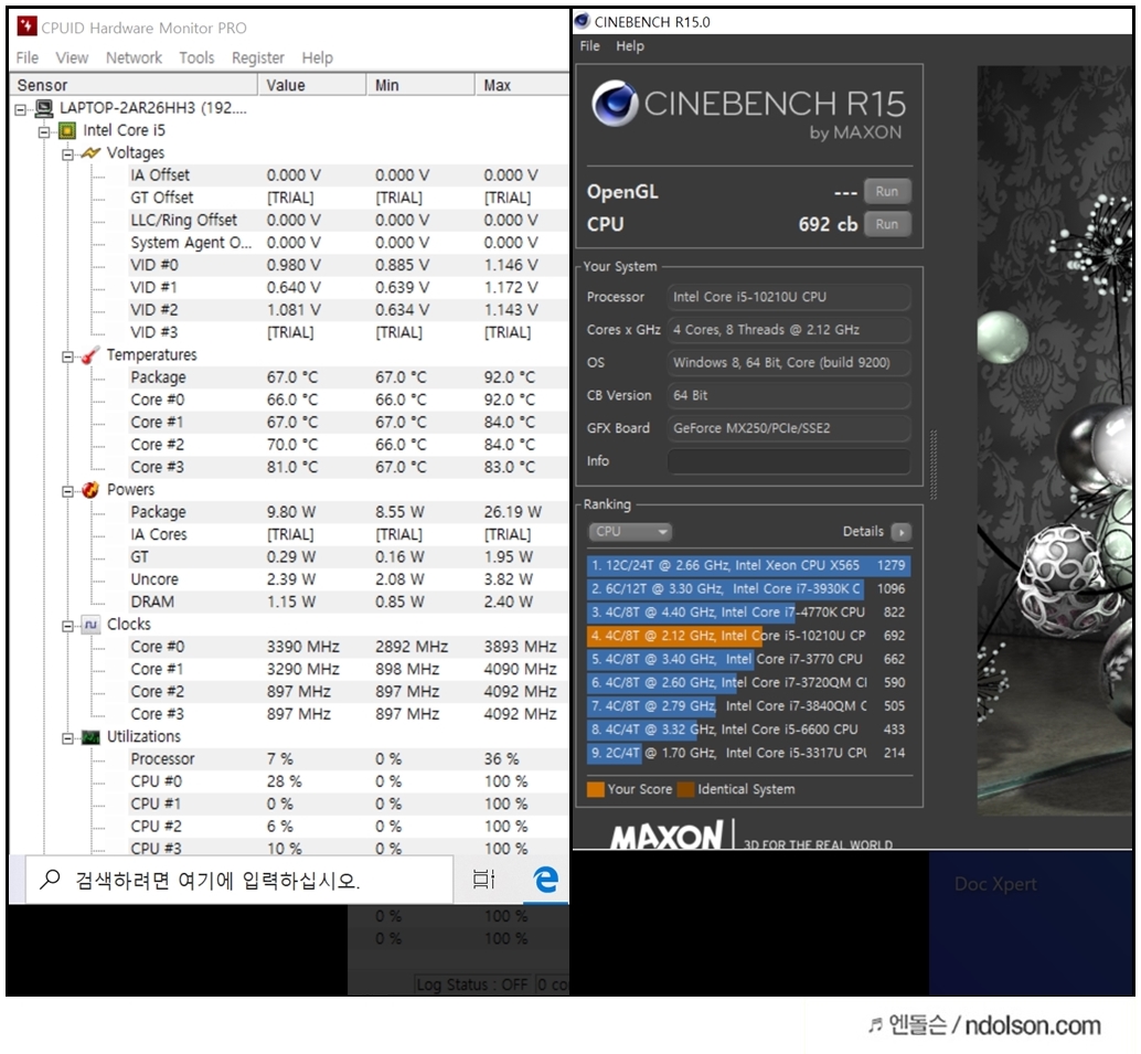 노트북 벤치마크 프로그램인 CPUID Hardware Monitor PRO와 CINEBENCH R15의 벤치마크 점수입니다.