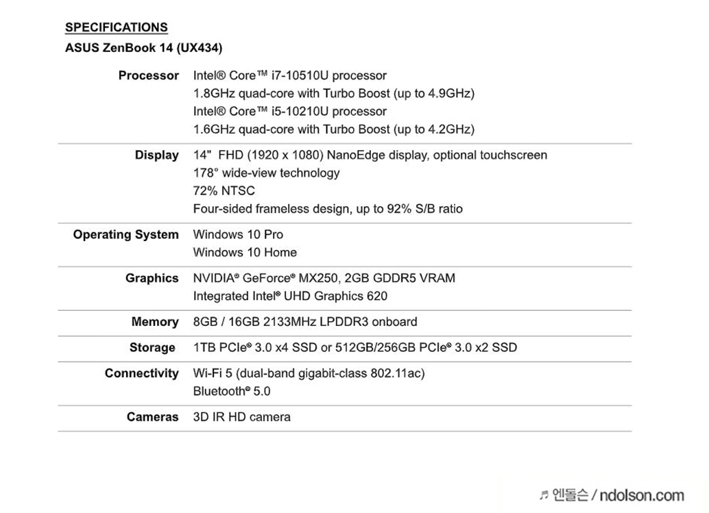 뉴 젠북 14의 스펙입니다. 인텔 i7-10510U CPU가 탑재되었으며 14인치 FHD(1920x1080) 해상도를 지원합니다.