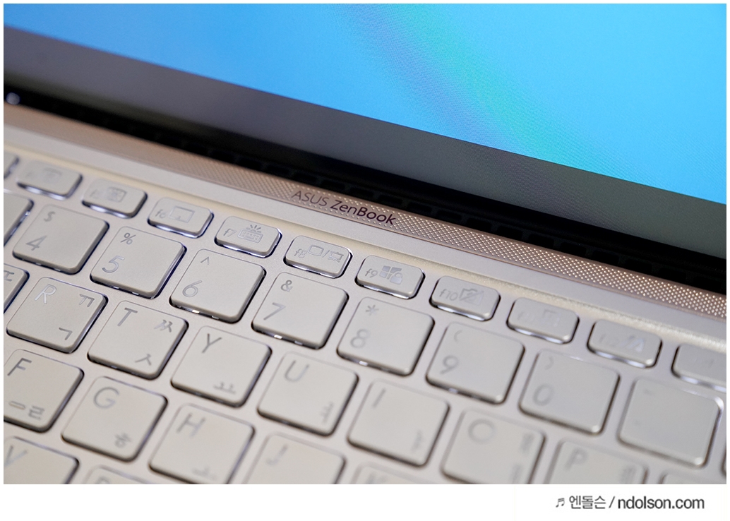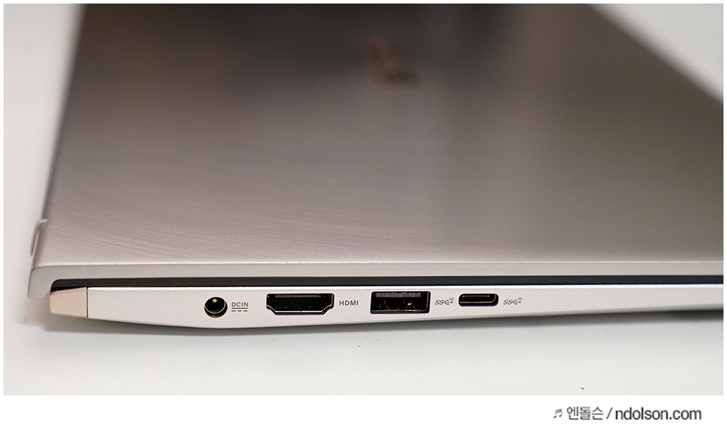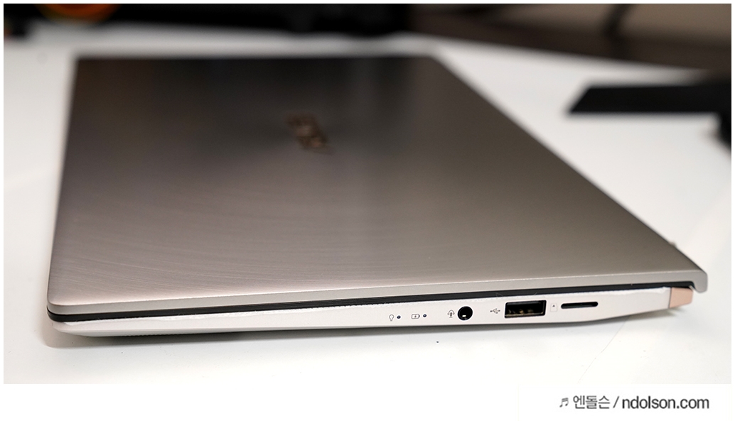 얇지만, New 젠북14의 좌우 측면에는 microSD슬롯, USB3.0 포트 x2, 3.5mm 오디오 잭, 풀사이즈의 HDMI 단자, USB-C 썬더볼트를 지원합니다. 작지만 알차게 인터페이스를 지원해서 울트라북이라고 할 수 있습니다.