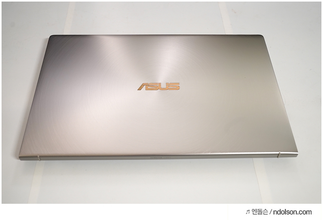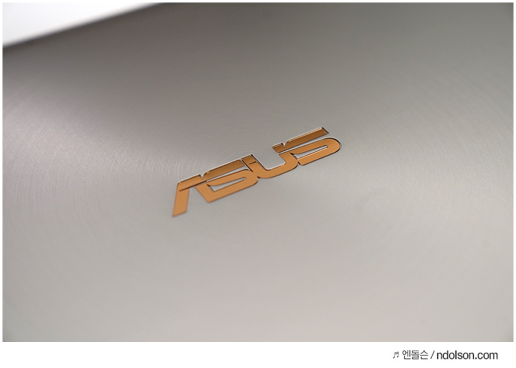 ASUS 에이수스 로고가 중아에 심플하게 골드로 각인되어 있습니다. 바디는 은색으로 단순 색상이 아닌 메탈을 느낄 수 있게 원형 빗살 무늬가 가미되어 있어 고급스럽게 되어 있습니다.