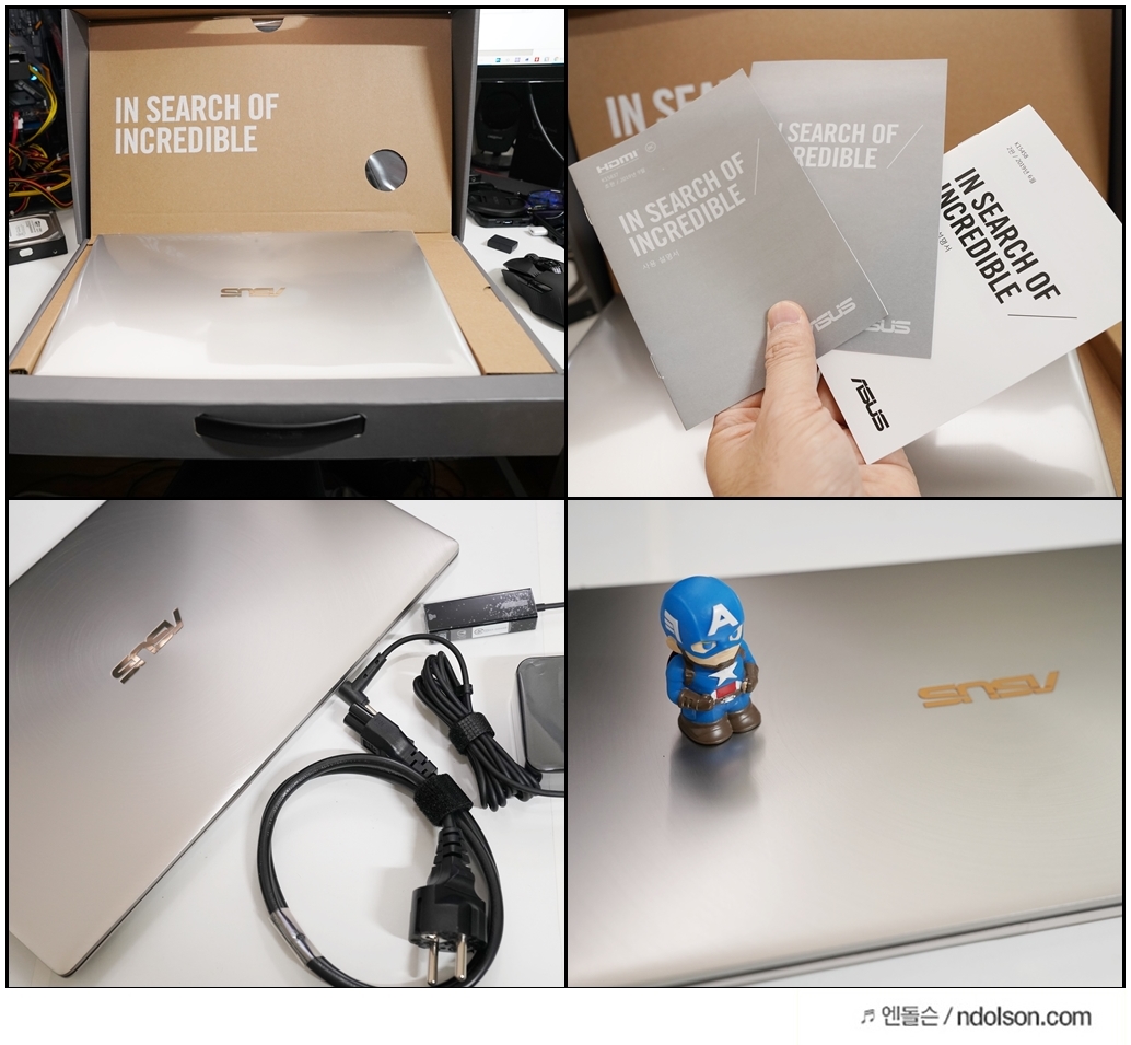 빠르게 에이수스 뉴 젠북14 노트북을 언박싱 해보았습니다. 간단한 글로벌 매뉴얼과 USB 랜포트 확장 액세서리, 심플한 전원 어답터 그리고 New 젠북14 노트북이 있습니다.