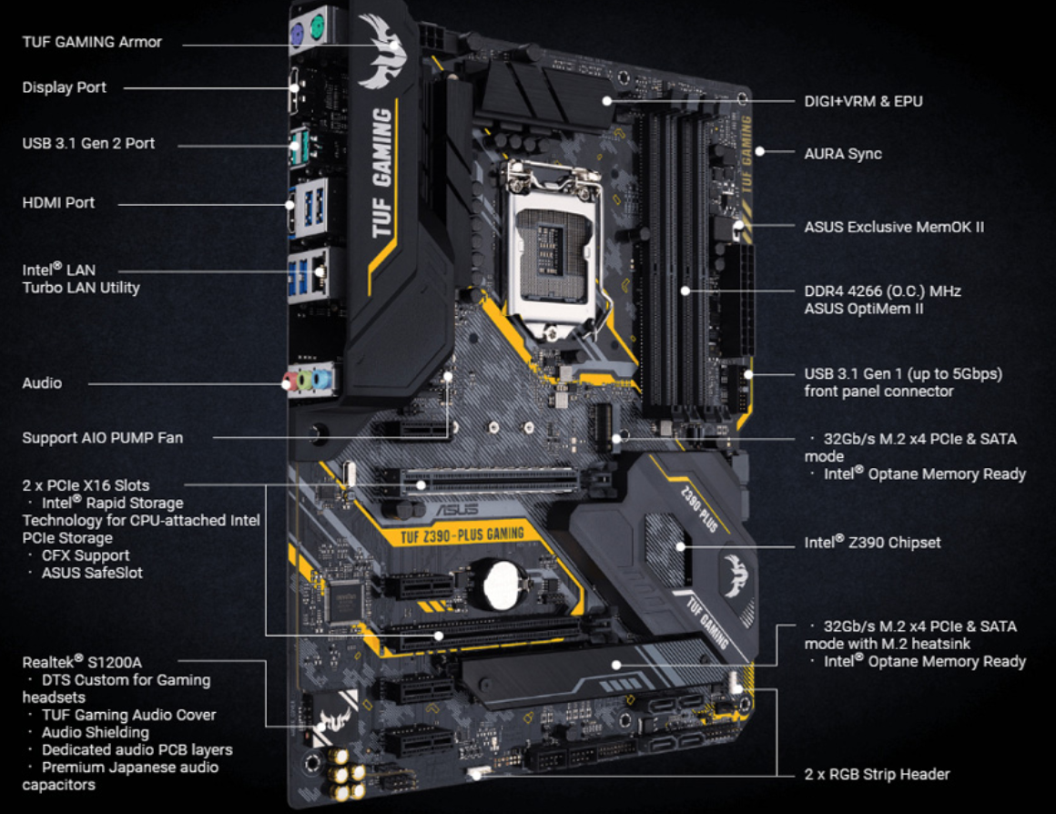 ASUS TUF Z390-PLUS GAMING은 Z390 메인보드로 인텔 9세대 코어 프로세스 탑재가 가능한 1151소켓를 지원합니다. 마더보드가 중요한 것은 램, CPU, 그래픽카드를 하나로 연결하고 과전류에 대한 보호조치도 이루어지기 때문입니다.