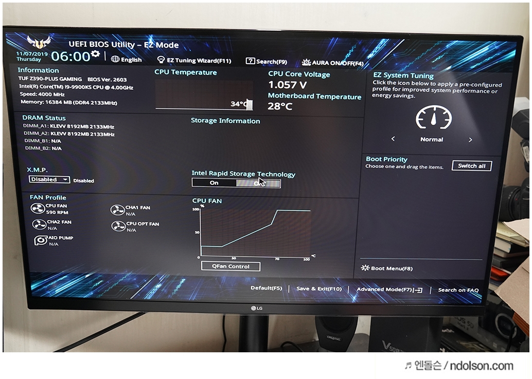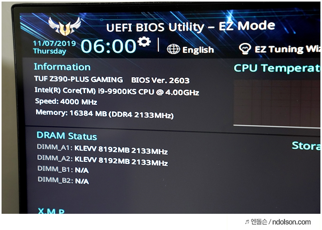 바이오스에서 ASUS TUF Z390-PLUS GAMING의 바이오스 펌웨어를 하였고, 정상적으로 i9-9900KS CPU가 인식된 것을 확인하였습니다.