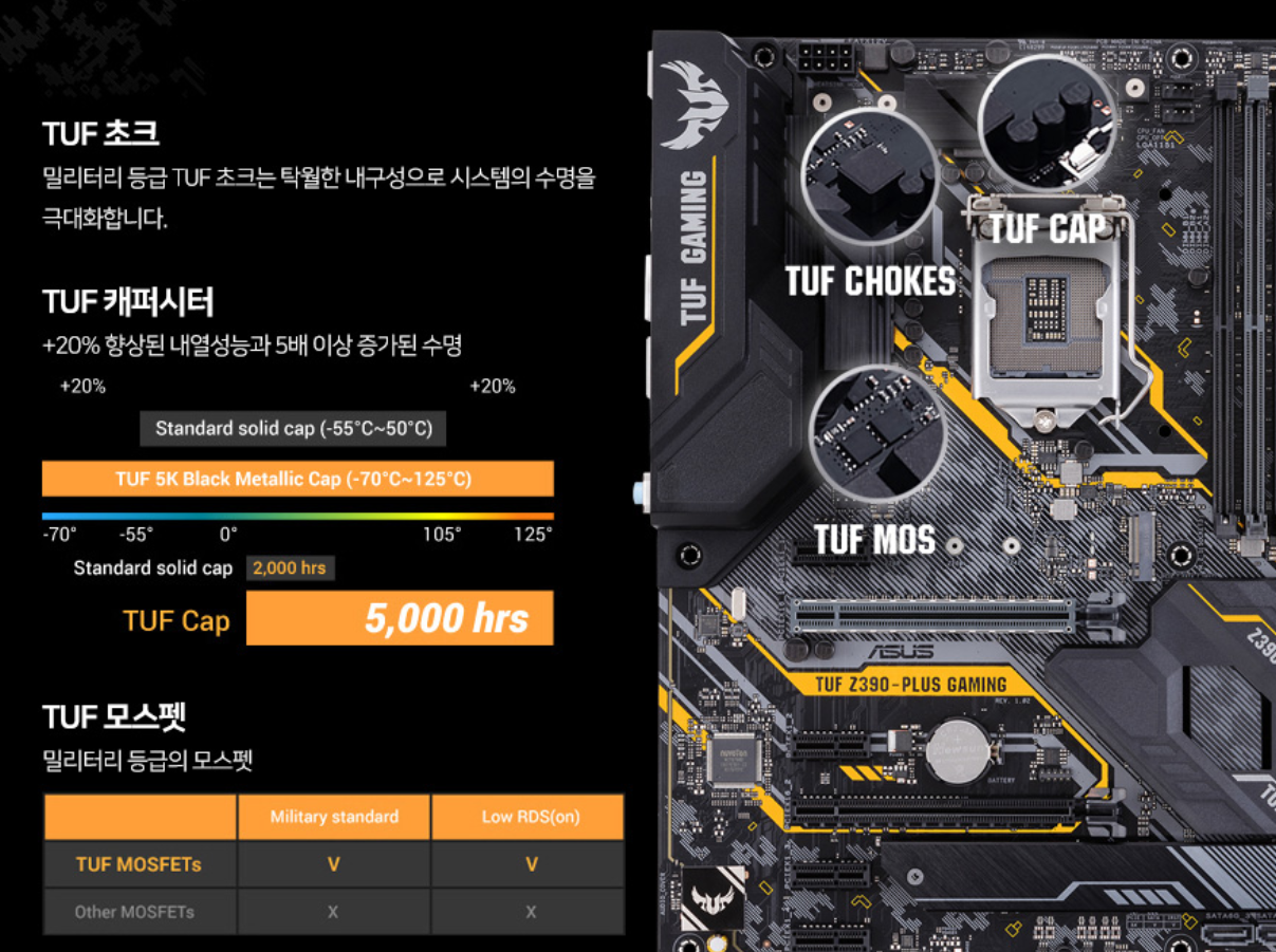 에이수스 TUF 메인보드는 내열성능이 뛰어나며, 시스템 수명을 향상시켜 PC조립 후 오래도록 컴퓨터를 사용할 수 있게 해 줍니다.