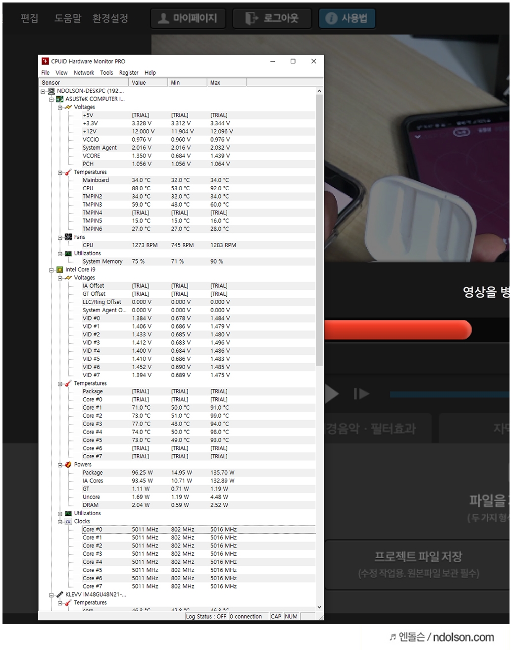 HWMONITOR-PRO 으로 메인보드 및 CPU 온도를 체크해보았습니다. 안정적인 전압 체크와 온도를 볼 수 있습니다. 올코어 5.0GHz가 오버클럭 없이 평상시에 나오는 성능이라는 게 놀라웠습니다.