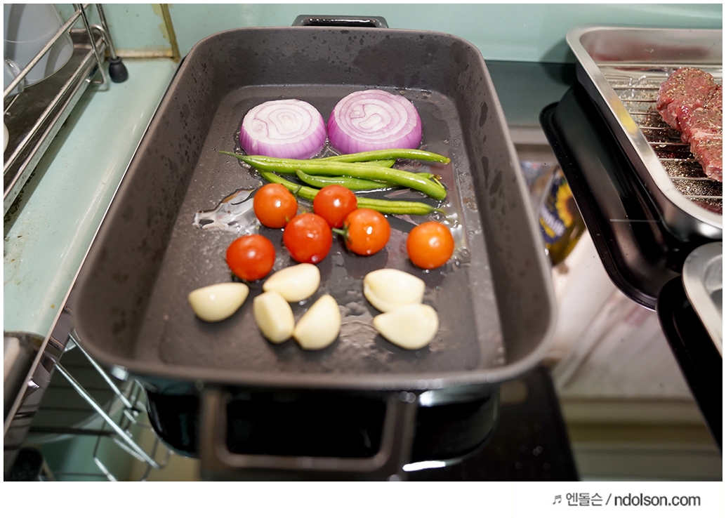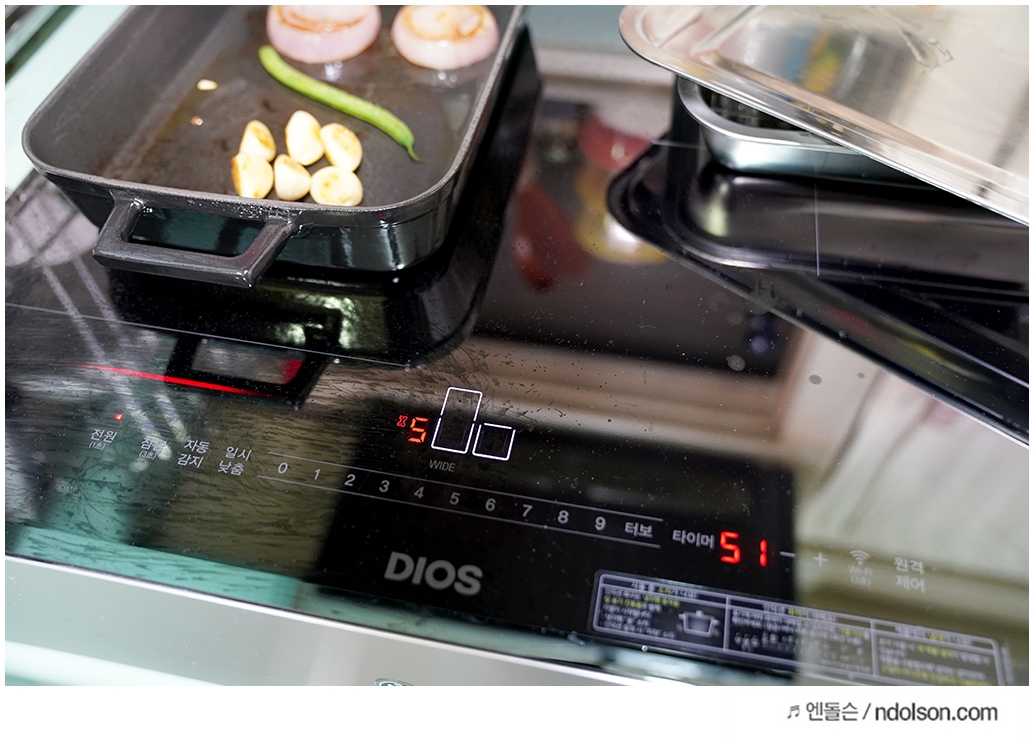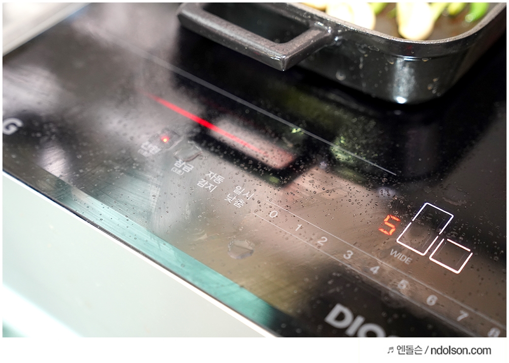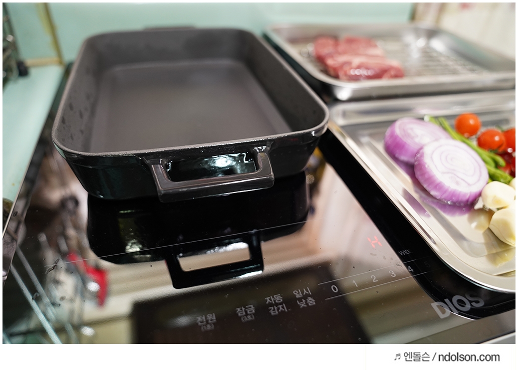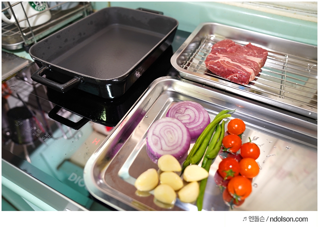 인덕션 와이드 존은 다양한 용기를 올려서 요리하기 정말 좋았습니다. 혹시나 집에서 스테이크를 즐기실 분이라면 무쇠 주물팬을 꼭 추천드리고 싶습니다. 고기의 맛이 남달라 지거든요~