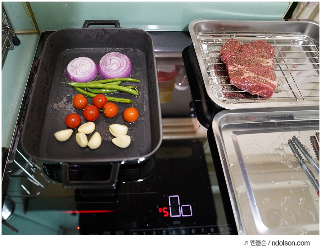 스테이크 같은 요리도 인덕션 불판의 화력을 각기 달리해서 요리가 가능한데요. 스테이크를 구워보니, 화력 조절을 해서 와이드 존으로 요리하니 스테이크 같은 두툼한 고기도 빠르게 익어 좋았습니다.