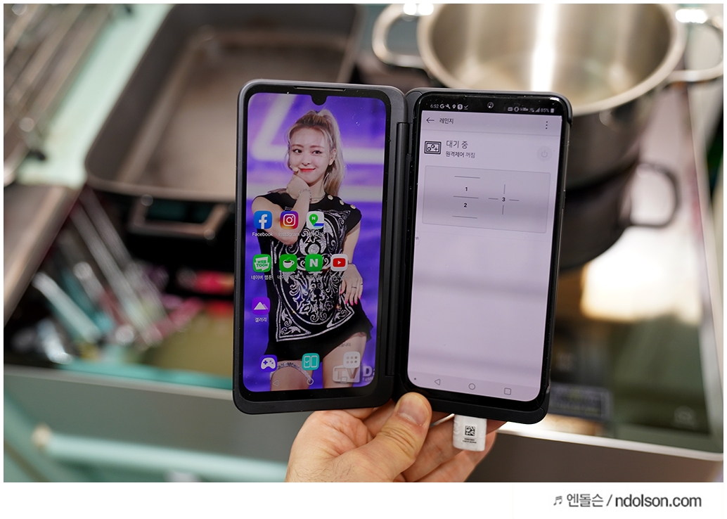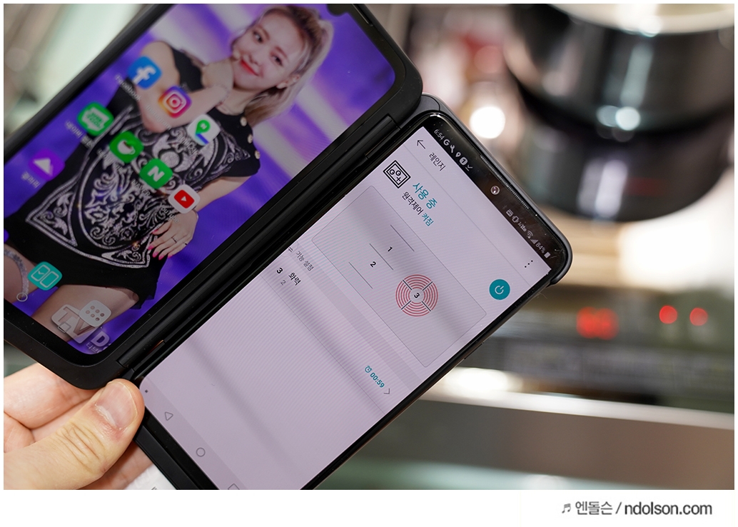 내 LG V50 ThinQ 스마트폰에서 LG 인덕션을 제어할 수 있습니다. 안전을 위해서 인덕션을 외부에서 켜는 것은 안됩니다. 화력 조절, 시간 조절, 화구 선택이 가능하니 스마트폰으로 쉽게 제어할 수 있습니다.