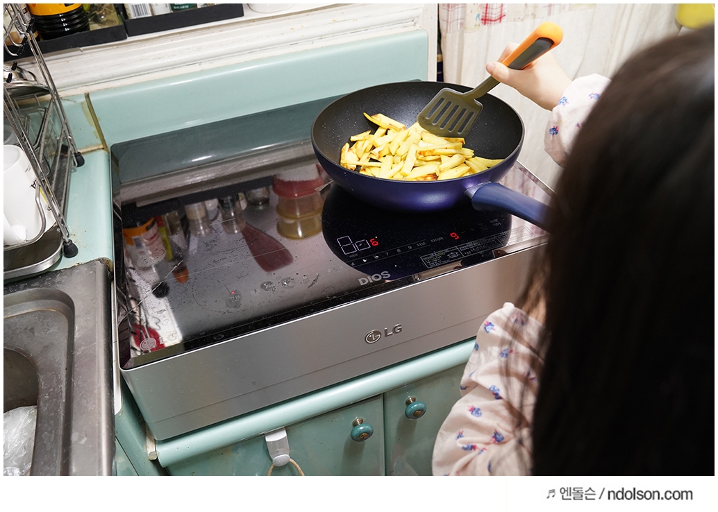 주말 아침에는 딸아이와 함께 요리를 하는 데, LG DIOS 인덕션 3구를 쓰니 가스냄새도 나지 않고, 안전해서 아주 만족스러웠습니다. 딸아이가 혹시나 잘못 만지거나 하는 일도 없고, 주변이 뜨거워지는 일이 없으니 부엌에서 요리하기 좋아졌습니다.