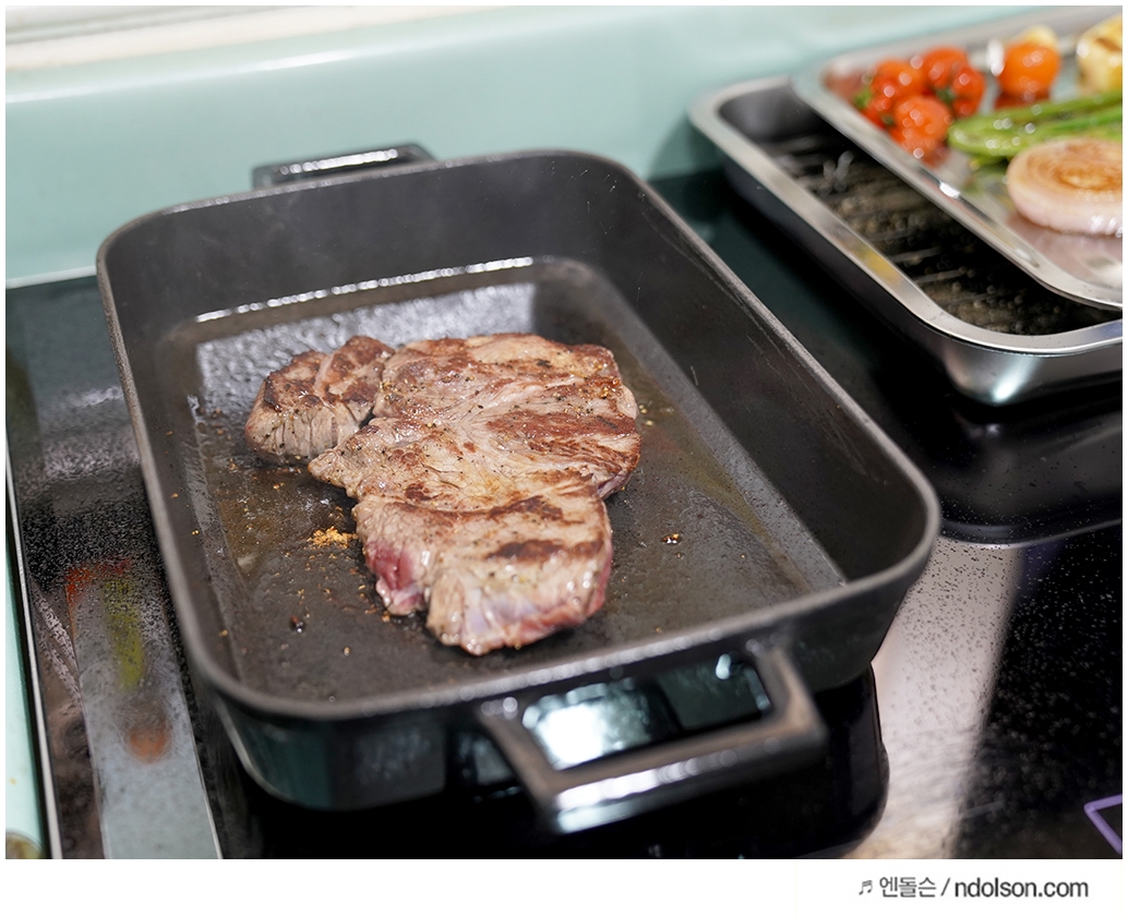 고기는 무쇠 주물팬에 구워야 맛있습니다. 높은 온도에 빨리 익혀 고기의 육즙은 살아 있고, 제대로 된 굽기가 나오는데요. 이런 무쇠 주물팬은 세로로 길어서 일반 가스레인지에서는 테두리가 열을 받지 못할 수 있는데요.