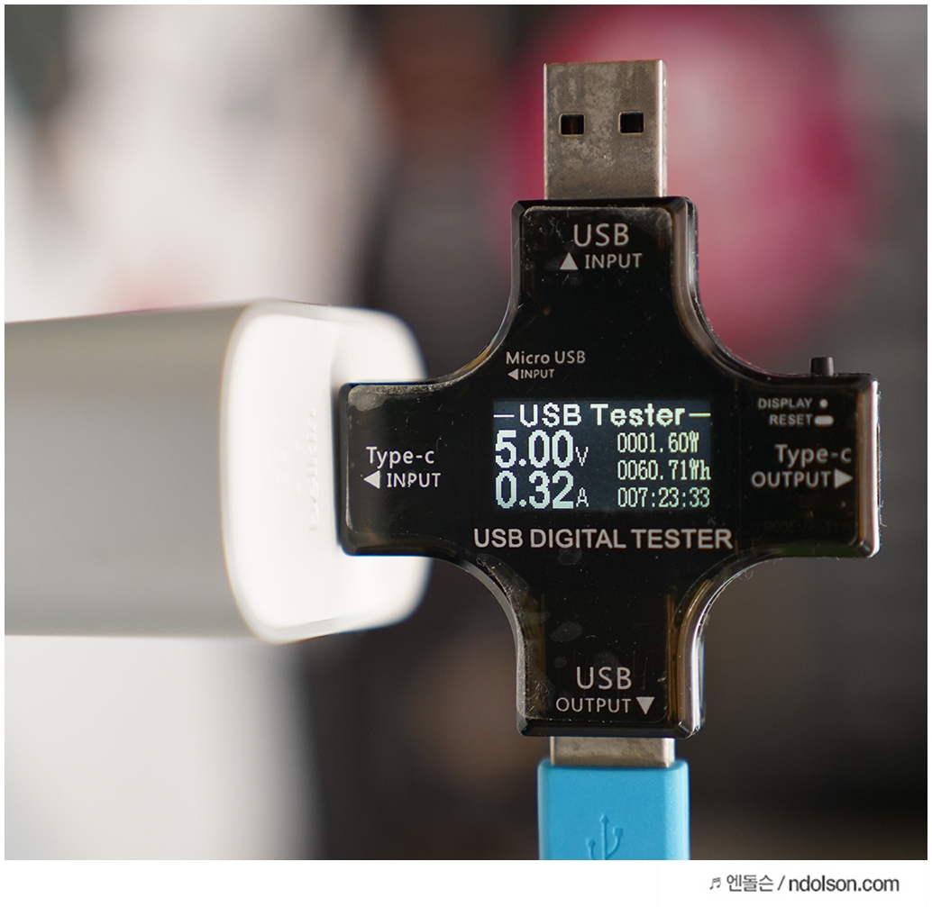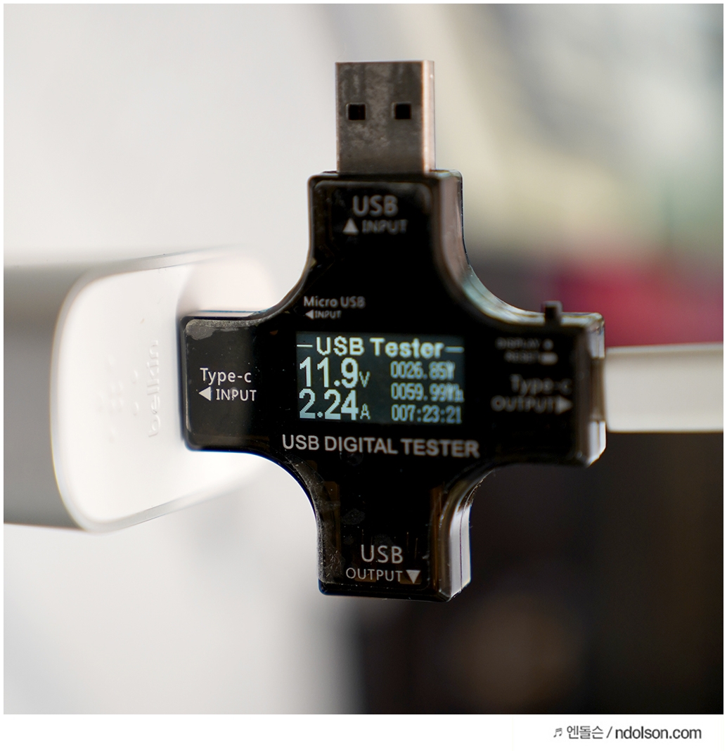 USB 테스터기로 측정해보니, LG 그램 노트북을 충전할 경우, 11.9V / 2.24A 의 INPUT이 나왔습니다. 노트북을 충전이 전원 연결 상태로 됩니다.
