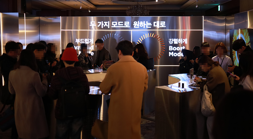 신제품 런칭행사에 오면 가장 좋은 것이 바로 여러가지 제품을 바로 비교하면서 체험해볼 수 있다는 것인데요. 바닥에는 직접 보고 만져보라고 "경험해보세요"라는 문구가 보입니다.