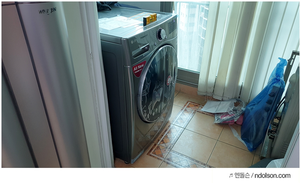 베란다가 평평하지 않고 턱이 있어 걱정했는데, ALL NEW 트롬 건조기 설치기사님이 설치 가능하다면서 수평도 잡아 주고 다 해주셨습니다.