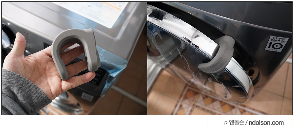 또 이건 뭐지? 했는데 내부 환기를 할 때 건조기 문에 달아서 닫히지 않게 해주는 환기용 도어 클립이더라고요. 건조기도 문을 열어서 환기를 시켜줘야 하는데요. 냄새가 나지 않게 환기용 도어 클립을 끼워주면 좋아요. 자석이라서 미사용 시 건조기에 붙여 둘 수 있습니다.
