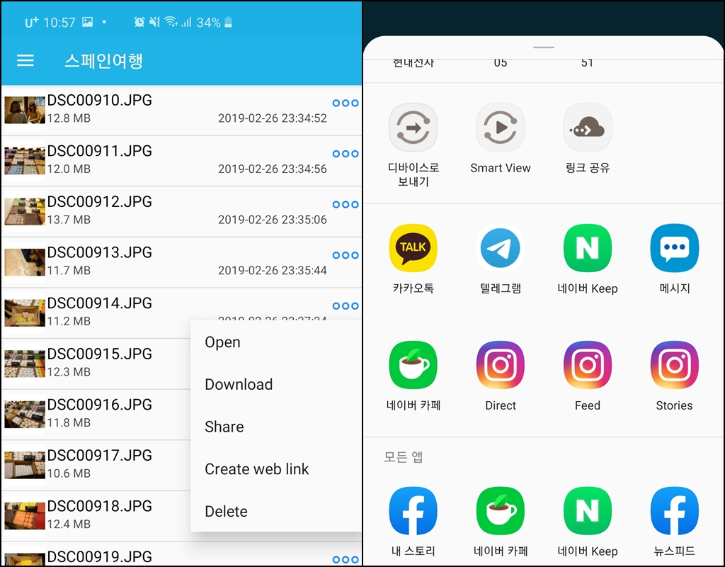 NAS의 문서, 사진, 동영상 등은 손쉽게 공유할 수 있습니다. Share (공유)를 눌러 다른 앱으로 공유할 수 있습니다.