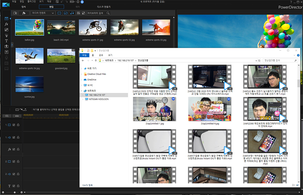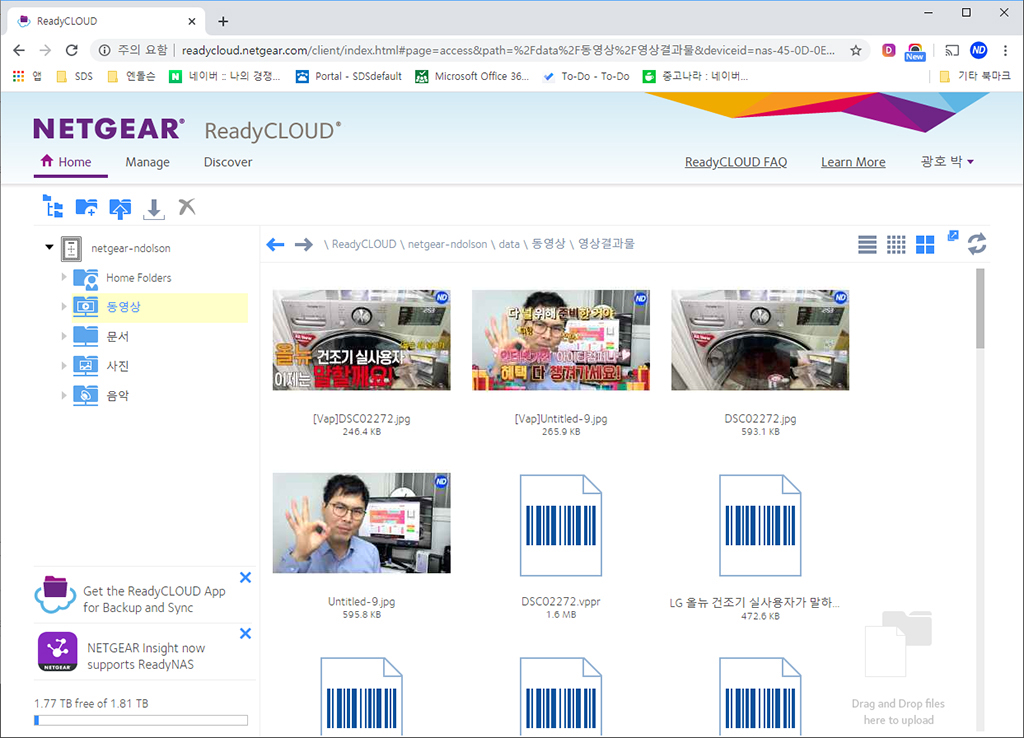 영상 작업물을 공유하고 있는 데, PC의 특정 폴더에 결과물이 NAS로 실시간으로 공유됩니다. 또 외부에서도 접속이 가능하여 손쉽게 결과물을 편집하거나 공유할 수 있습니다. 여러 명이 작업하는 환경에 딱 맞는 것이죠.