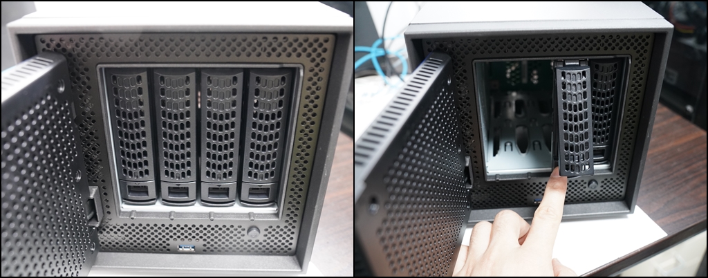 전면이 뚜껑처럼 열리게 된 구조로 되어 있습니다. 고급형 NAS라서 나사를 돌릴 필요 없이 이렇게 뚜껑을 열어서 바로 NAS용 하드디스크를 손쉽게 장착할 수 있게 되어 있습니다.