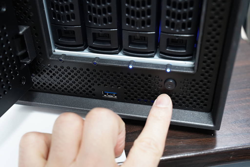 기업용 NAS 스토리지 특성상 자주 끄거나 켜지 않기 때문에 안쪽에 전원 스위치가 위치하고 있습니다. 자동으로 꺼지면 절전도 됩니다.
