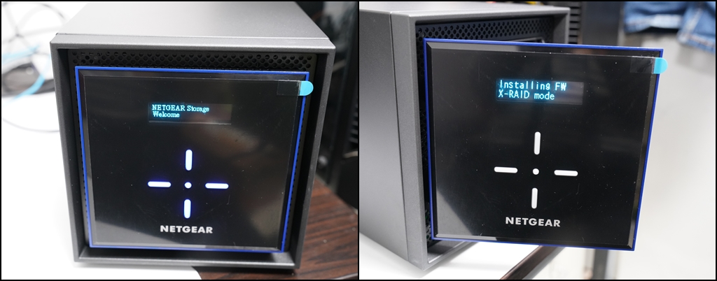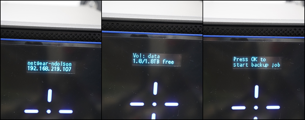 켜지면서 자동적으로 하드디스크에 NAS용 OS가 설치되며, 업데이트가 진행됩니다. 또 넷기어 관리자 페이지는 전면에 십자가 버튼을 상/하 눌러서 정보를 확인할 수 있게 되어 있습니다. 또 버튼 클릭만으로 손쉽게 Backup Job(백업 작업)을 실행할 수 있어서 편리합니다.