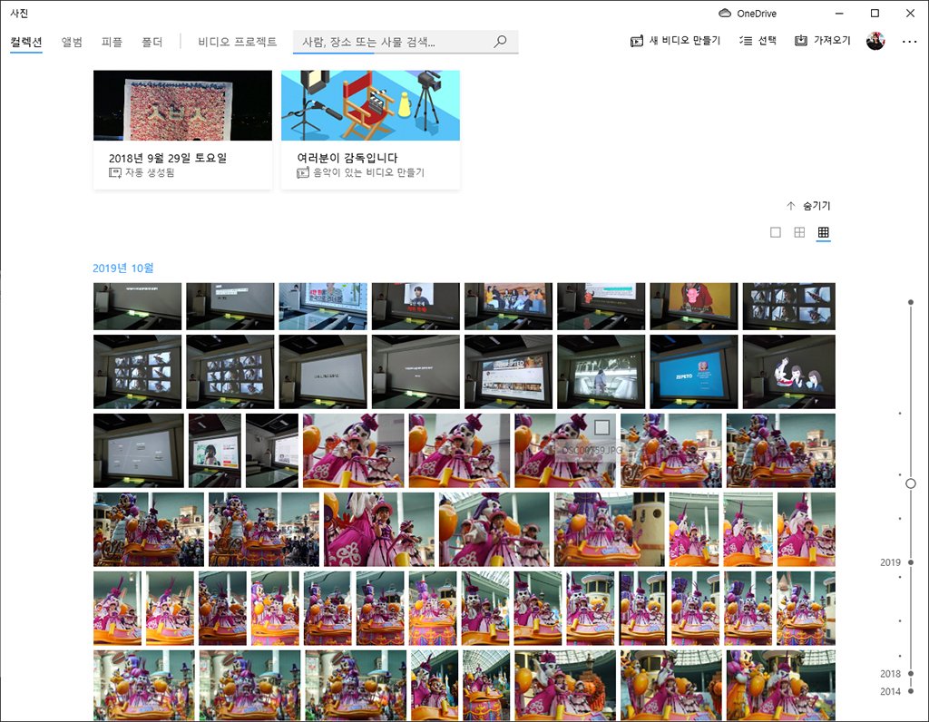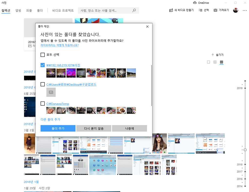 Windows 10의 사진 앱에 NAS 스토리지를 연동하였습니다. 다수의 사진은 손쉽게 연동하여 보거나 편집할 수 있습니다.