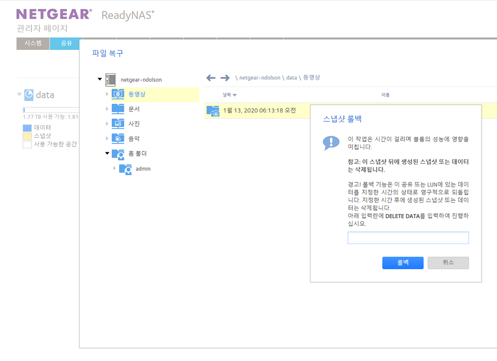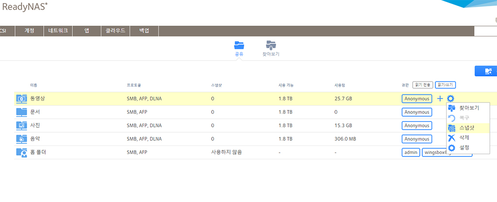 랜섬웨어 같은 변종 바이러스로 내 소중한 데이터를 인질로 잡아 돈을 요구하는 경우가 있습니다. 하지만 넷기어 RN424 NAS는 무제한 스냅샷을 지원합니다. 실시간 백업을 통해 작업 특정 시점 이전으로 되돌릴 수 있습니다. 동영상 작업 폴더에 스냅샷을 눌러서 생성하여 보았습니다.