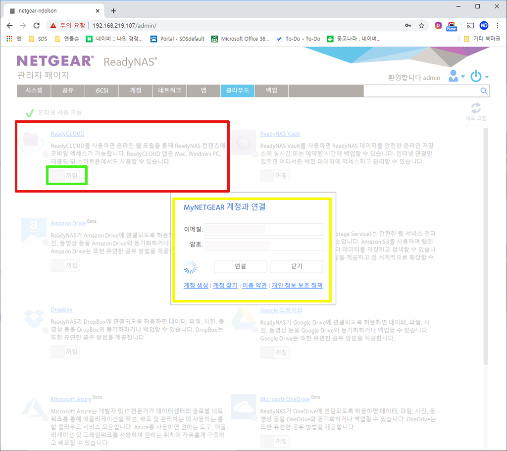 인터넷은 유플러스 기가급을 회선을 사용하였습니다. 넷기어 RN424 NAS가 외부에서도 접속할 수 있게 ReadCLOUD 설정을 켜주여야 합니다.