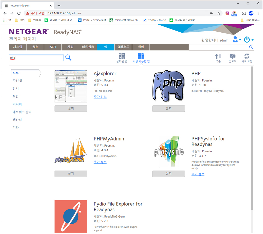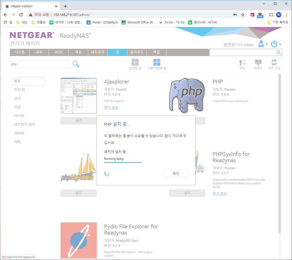 다양한 앱을 지원합니다. 필자가 개발자다 보니 NAS에 웹서버를 구성하고 싶어서 PHP를 설치해보았습니다. 그 외에도 phpMyAdmin 등 MYSQL, JAVA 등도 손쉽게 클릭으로 설치할 수 있게 지원됩니다.