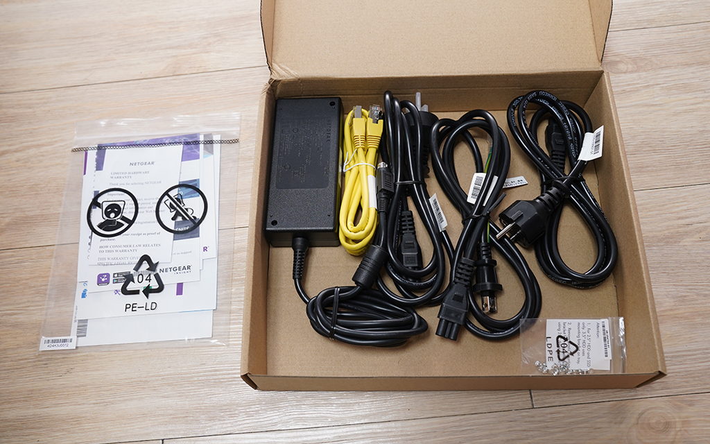 넷기어 NAS를 택배로 받고 바로 개봉하여 보았습니다. 설명서와 다양한 전원장치가 지원됩니다. 유럽형부터 돼지코까지 전원선이 다양하게 지원됩니다. 노란색 랜선도 같이 들어 있습니다.