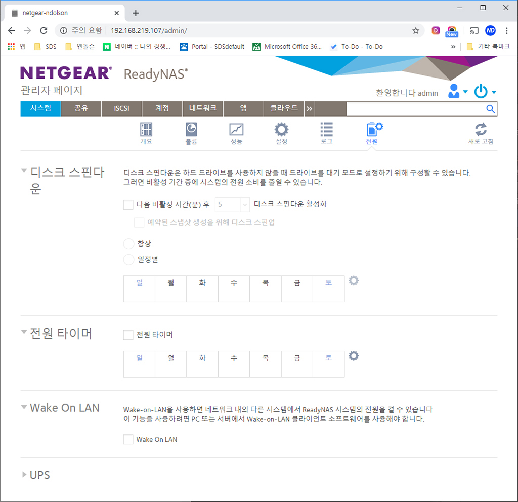 전원장치 설정을 통해서 타이머를 설정하거나 Wake On LAN 설정으로 네트워크로 켜거나 하는 설정도 가능합니다. 평일만 사용한다면, 디스크 스핀다운의 일정을 설정할 수 도 있습니다.