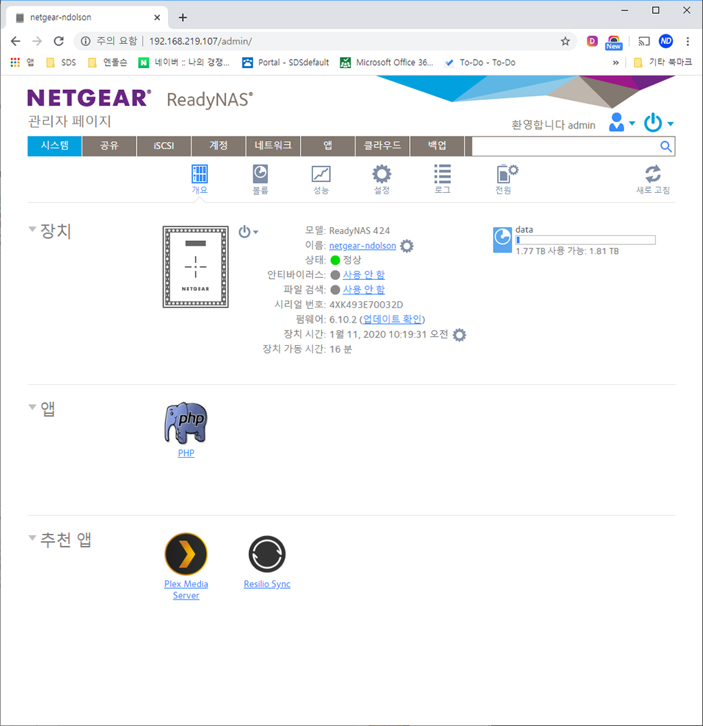 netgear-ndolson이라고 넷기어 RN424 NAS의 이름을 정했습니다. 개요에는 전체적인 대시보드로 정보가 요약되어 보입니다.