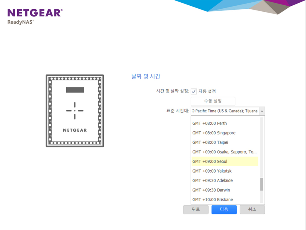 넷기어 전면 LCD에 쓰여 있는 IP주소를 접속하여 NAS 초기 설정을 합니다. Seoul GMT 시간을 설정하여 줍니다. 설치 중간에 NAS 이름을 정하는 부분이 있으니 조금 의미 있는 이름으로 정해줍니다.