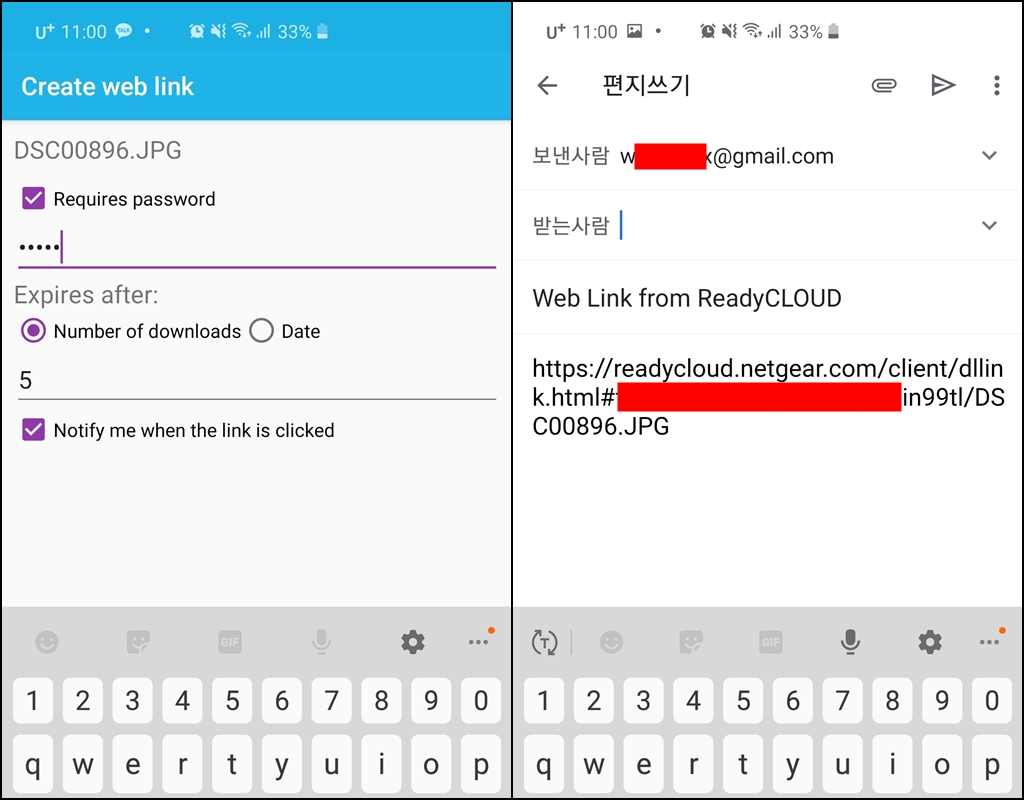 또 Create Web Link를 눌러 패스워드를 걸거나 날짜 제한, 다운로드 횟수 제한을 걸린 링크를 생성해 메일로 보낼 수 도 있습니다. NAS 장치에서 용량이 큰 영상 작업한 결과물을 외부 메일로 공유할 때, 상당히 편리합니다.