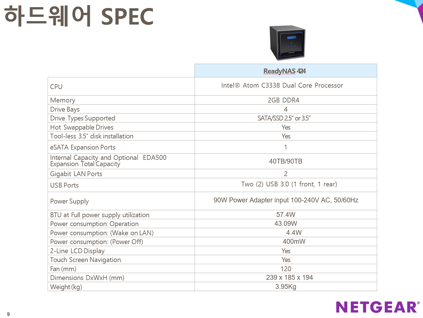 넷기어 기업용 스토리지 RN424 NAS의 스펙은 위와 같습니다. Atom C3338 듀얼 코어 프로세스를 탑재하였고 2GB DDR4 RAM을 탑재하였습니다. 스펙에 40TB 구성과 기타 옵션으로 90TB까지 설정도 가능하다고 되어 있네요. 방대한 스토리지 구성을 하고 싶은 분에게 추천할 수 있는 NAS입니다.