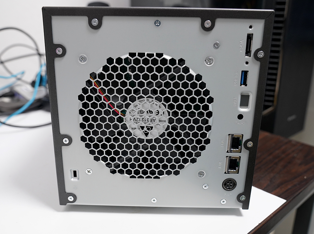 후면에는 기가비트급 랜 포트가 2개 지원되며, USB3.0 포트 1개, eSATA 인터페이스를 지원합니다. 회사내에서 여러 사용자가 다수 NAS장치에 접속 가능하게 랜 포트가 2개 지원되어 빠른 네트워크 속도를 보여주게 됩니다.