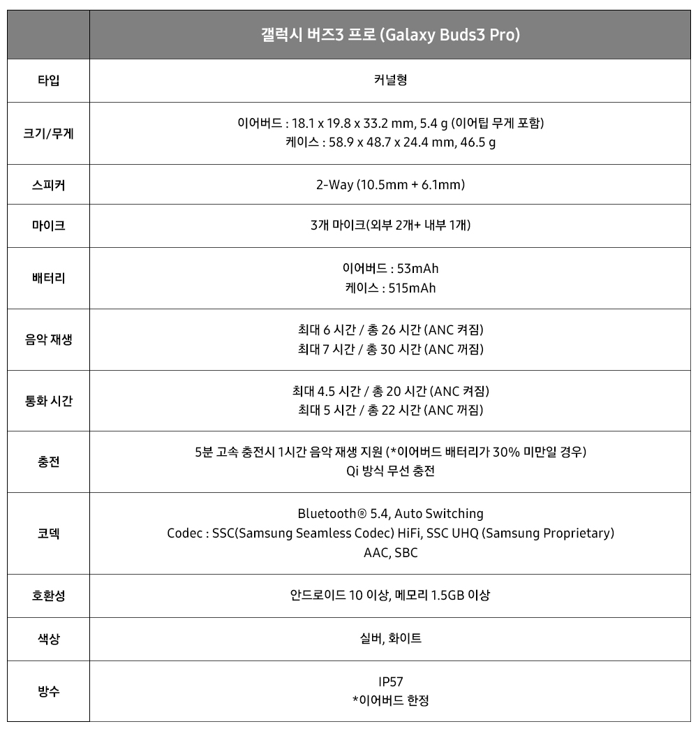 갤럭시 버즈3 프로는 ‘평판 트위터(Planar Tweeter)’와 ‘2-Way 스피커’를 탑재해 고음질 오디오를 제공합니다. SSC(Samsung Seamless Codec)를 통해 24bit 96kHz의 초고음질 오디오를 지원하며, ANC(Active Noise Cancelling) 기능도 강화되었습니다.