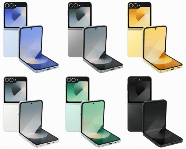 갤럭시 Z 플립6 색 : 블루, 실버 쉐도우, 옐로우, 민트, 크래프티드 블랙 (단독), 화이트 (단독), 피치 (단독)