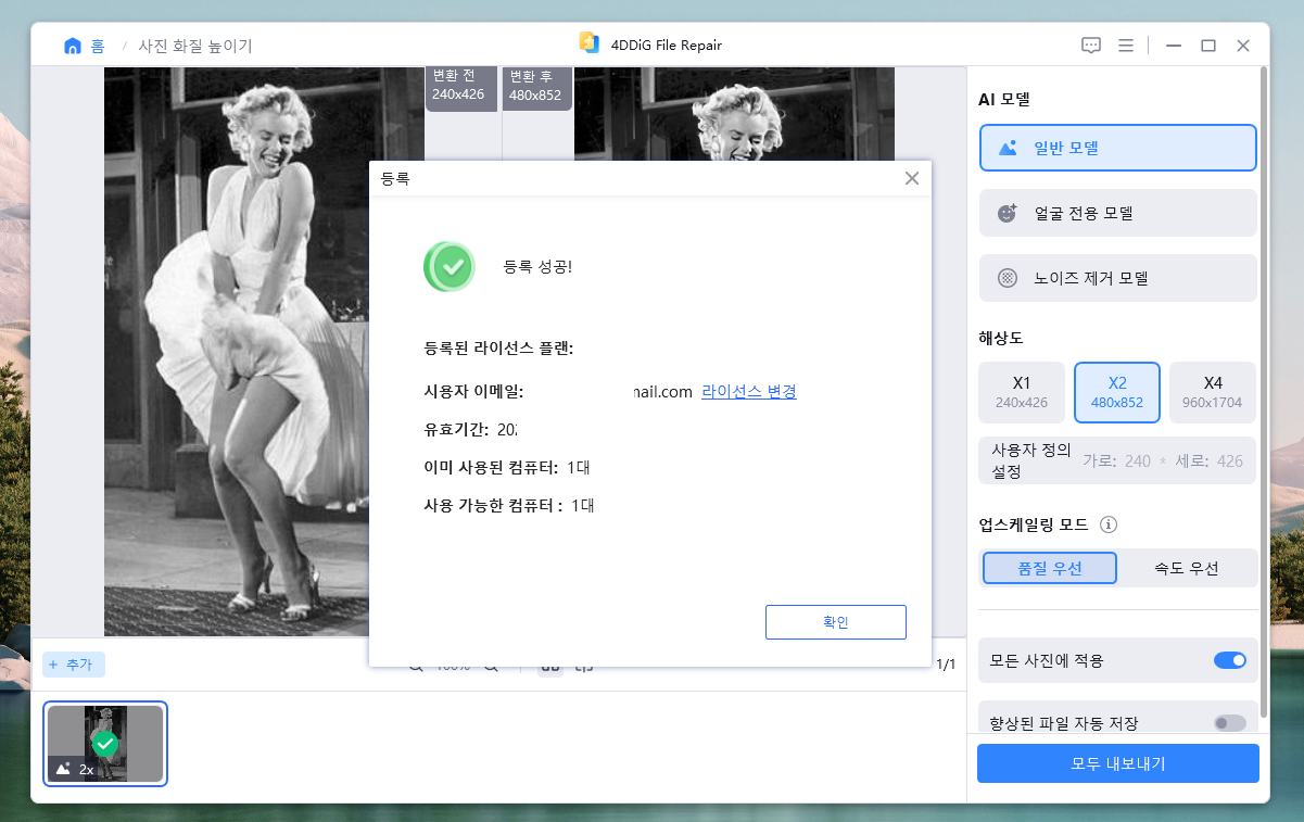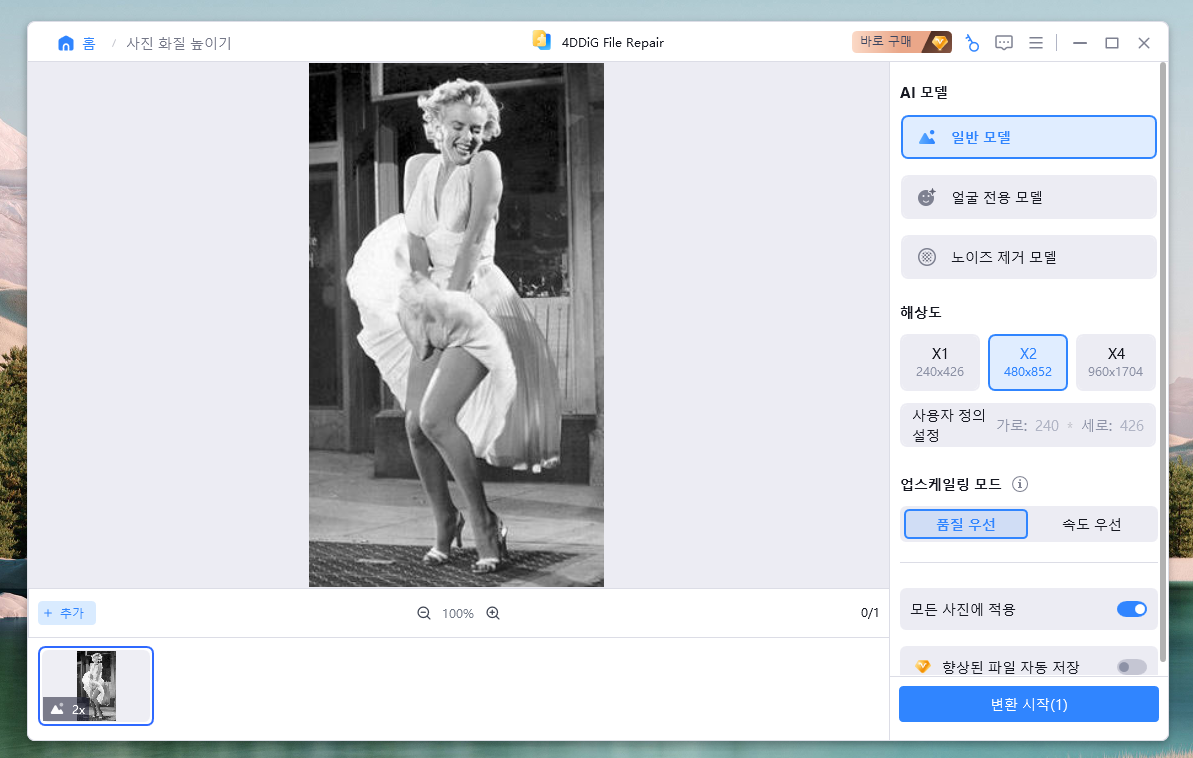 옛날 흑백사진이고 해상도도 낮은데, 4DDiG File Repair 프로그램으로 사진 해상도도 높일 수 있습니다. 원클릭만으로 손상되어 흐릿해진 이미지를 화질 개선하여 선명하게 만들어 줍니다.
