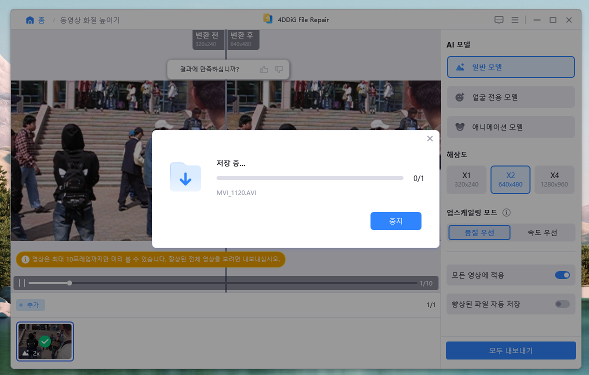 이제 실제로 4DDiG File Repair를 사용법은어렵지 않습니다.또 일반, 얼굴전용, 애니메이션모델에 따라 AI모델을 선택해 정밀하게 영상을 복원할 수 있습니다.