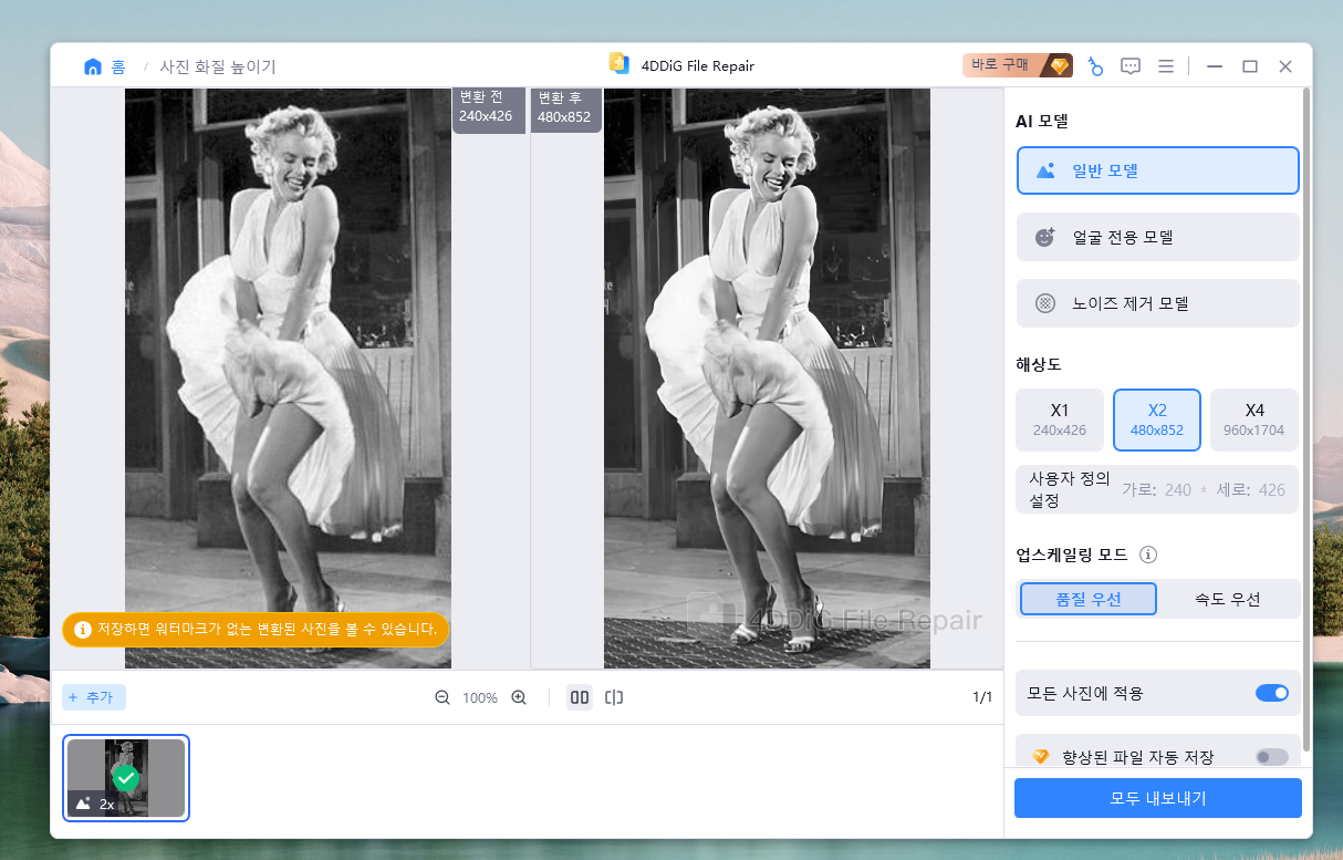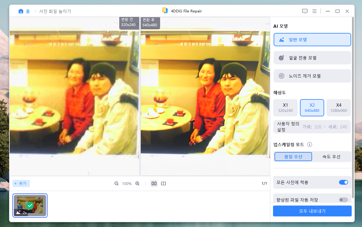 옛날 흑백사진이고 해상도도 낮은데, 4DDiG File Repair 프로그램으로 사진 해상도도 높일 수 있습니다. 원클릭만으로 손상되어 흐릿해진 이미지를 화질 개선하여 선명하게 만들어 줍니다.