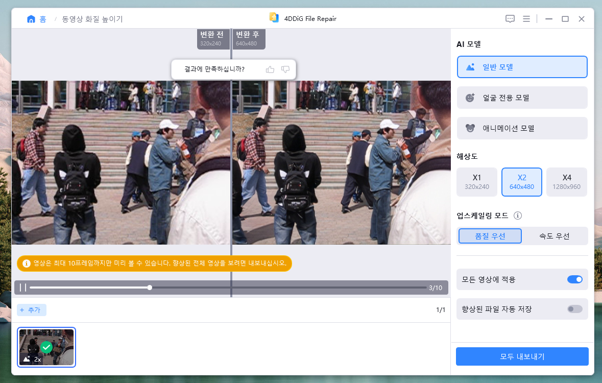 조작이 간편하다는 장점도 있었습니다. 4DDiG File Repair는 손쉽게 몇 번의 클릭만으로 동영상과 사진의 화질을 개선하고 해상도를 높일 수 있습니다. 개인적으로는 물론 업무적인 용도로도 다양하게 활용할 수 있으니 업스케일링이 필요한 자료가 있다면 이용해 보시기 바랍니다.