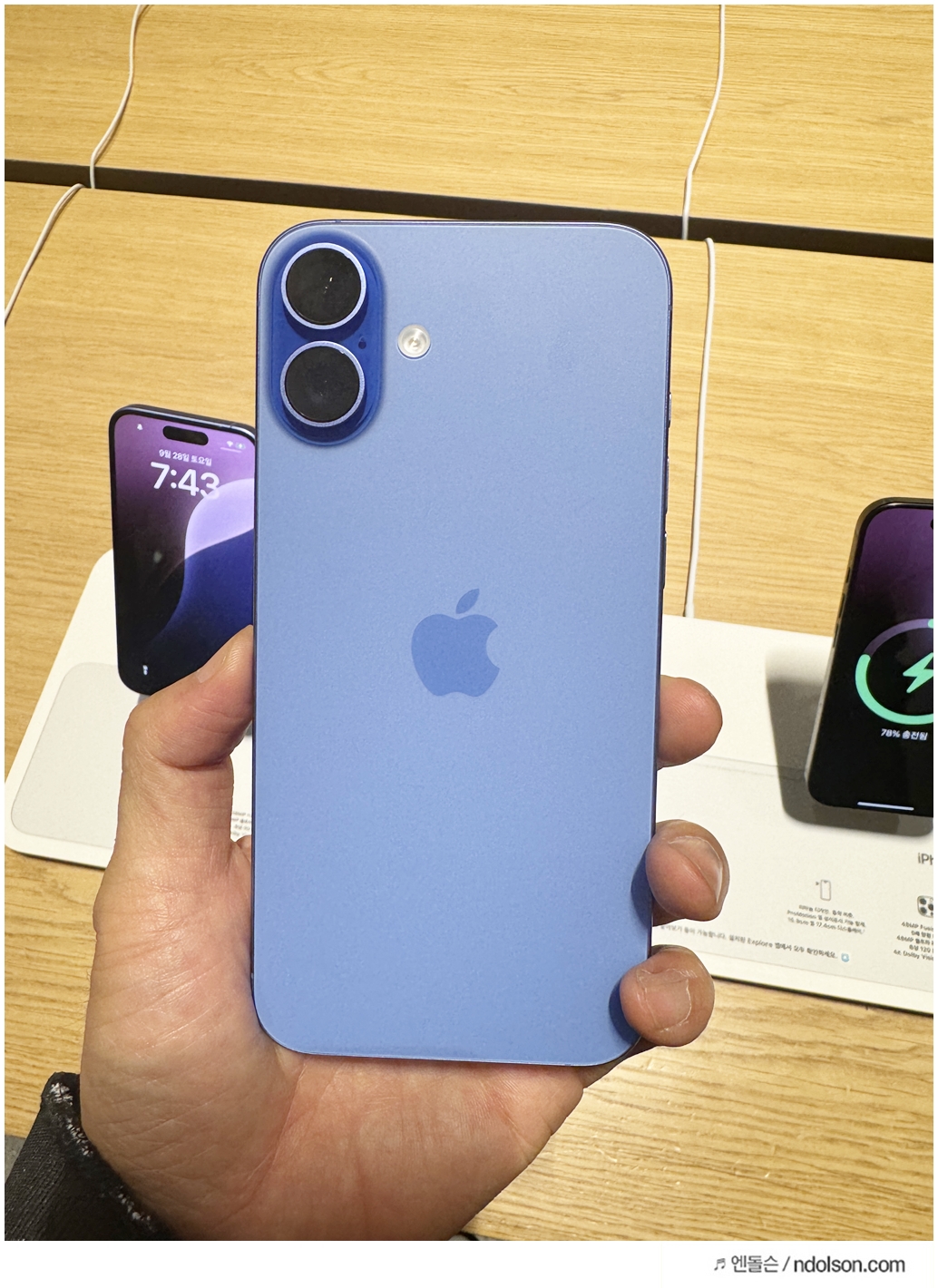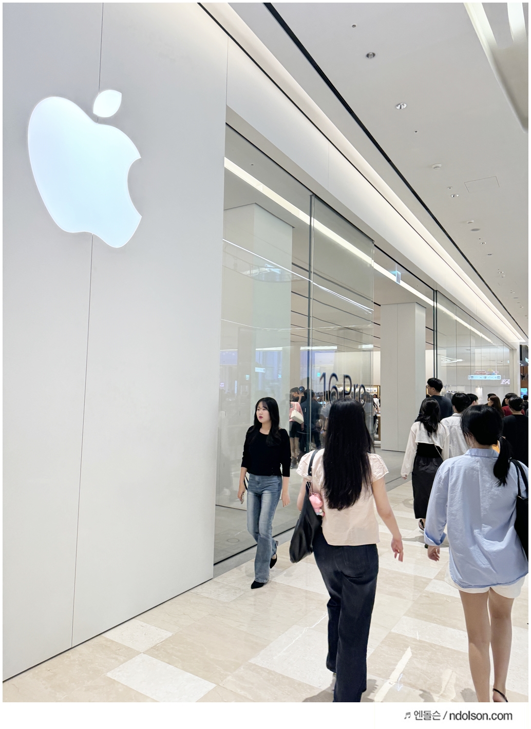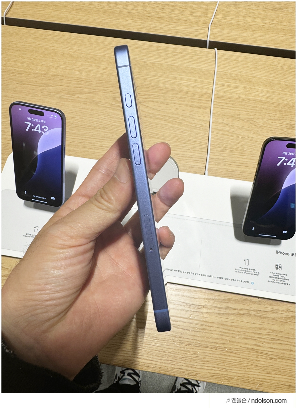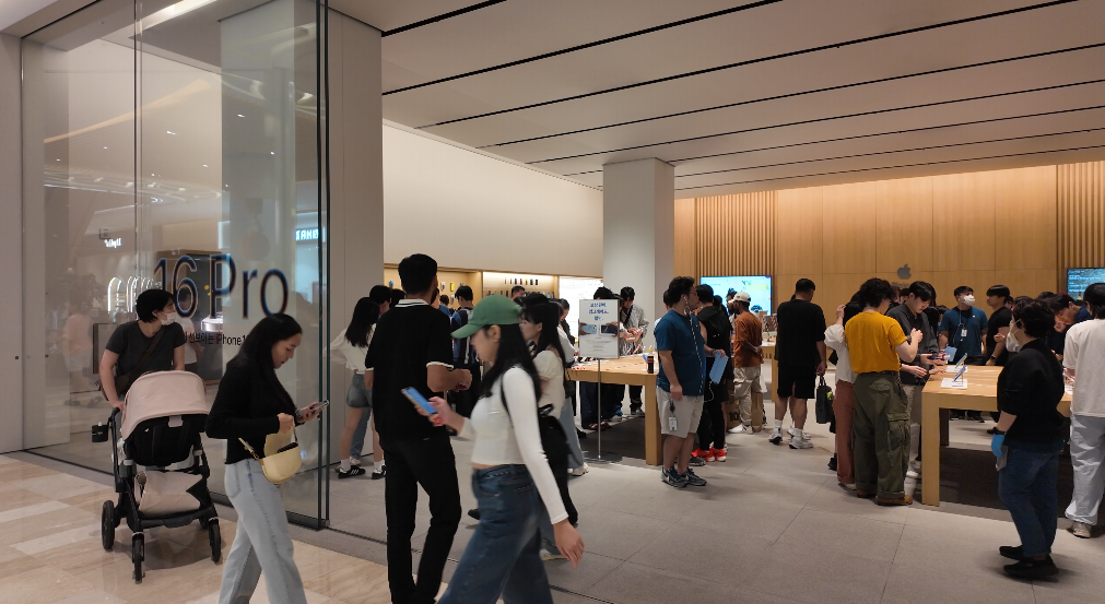 주말이지만 사람들이 많았습니다. 직접 아이폰 16의 색상이나 실물을 보러 온 사람들이 많았고요.