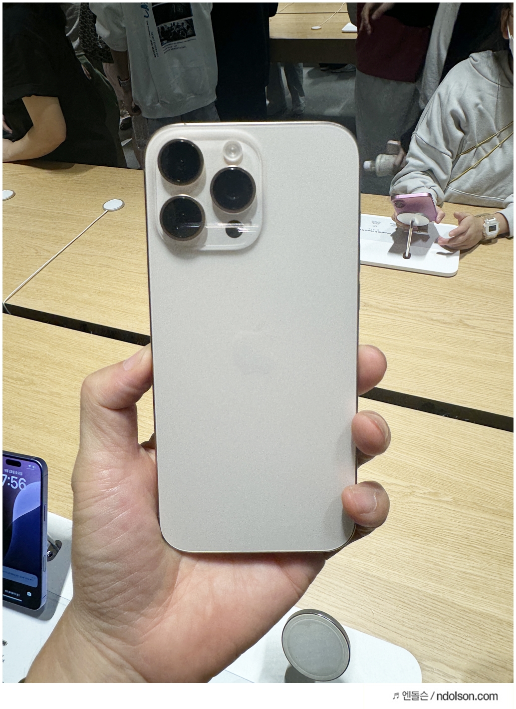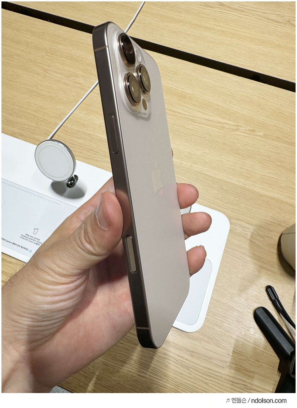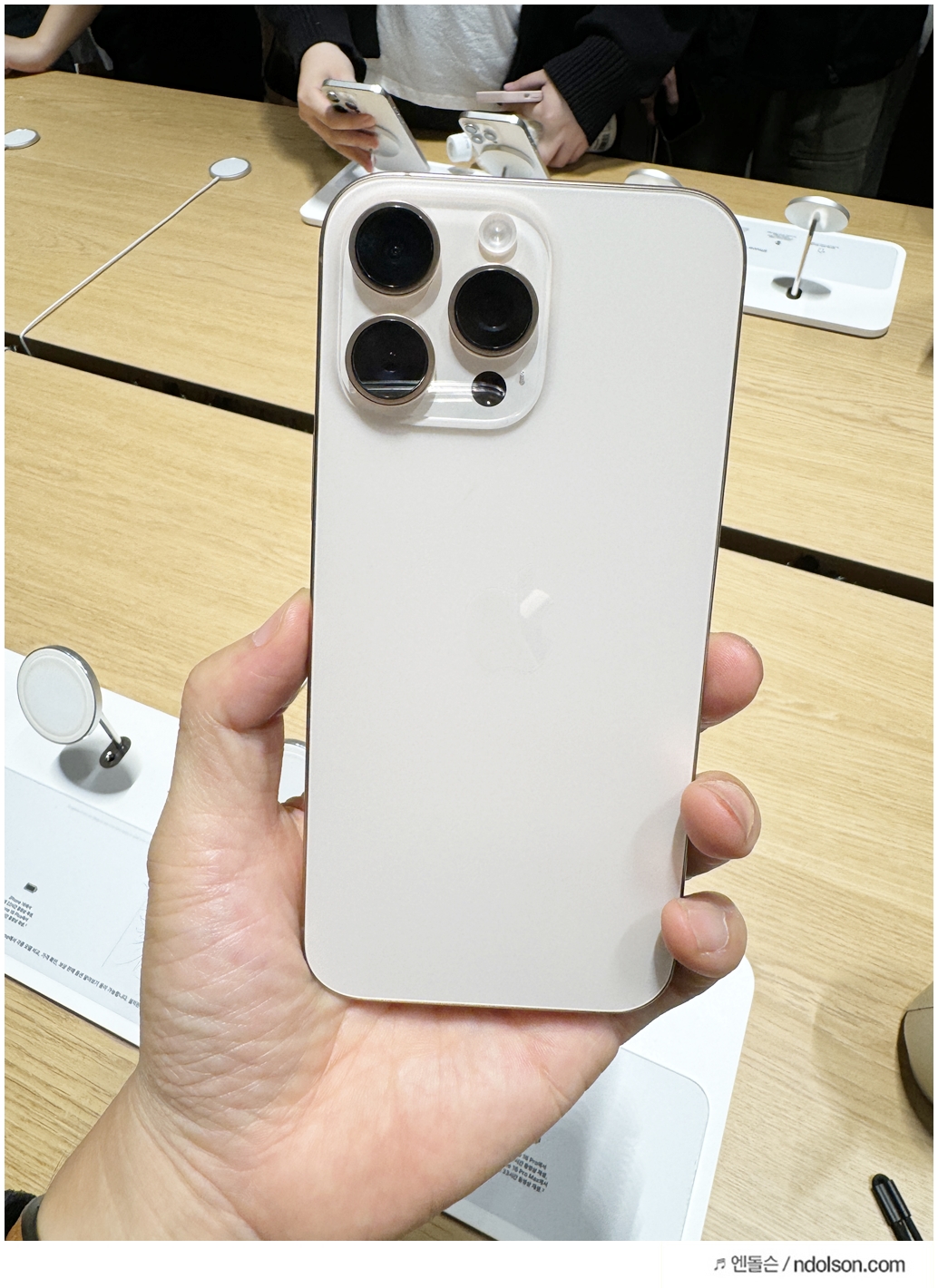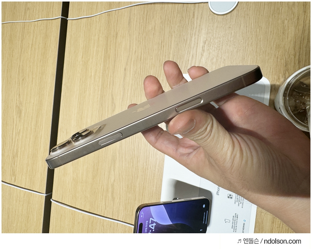 또 이번에 새롭게 추가된 색상들이 있는데요. 저는 '데저트 티타늄' 색상을 선택했습니다. 데저트 티타늄은 부드러운 핑크빛이 은은하게 감도는 독특한 색상으로, 실물로 보면 더욱 매력적입니다. 다만, 다른 사용자들에게는 호불호가 갈리는 색상이라 선택에 신중할 필요가 있어 보입니다. 그 외에도 블랙 티타늄, 화이트 티타늄, 그리고 내추럴 티타늄이 제공되며, 각각의 색상이 티타늄 특유의 고급스러움을 더해줍니다.