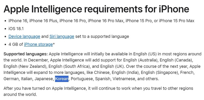 애플 인텔리전스는 iOS 18.1 버전부터 제공되며, 생성형 글쓰기, 통화 녹음 및 요약, Siri와의 자연스러운 대화 등 다양한 기능을 포함하고 있어, 한국어 지원 시 더욱 많은 사용자들이 이 기능을 활용할 수 있을 것으로 보입니다.