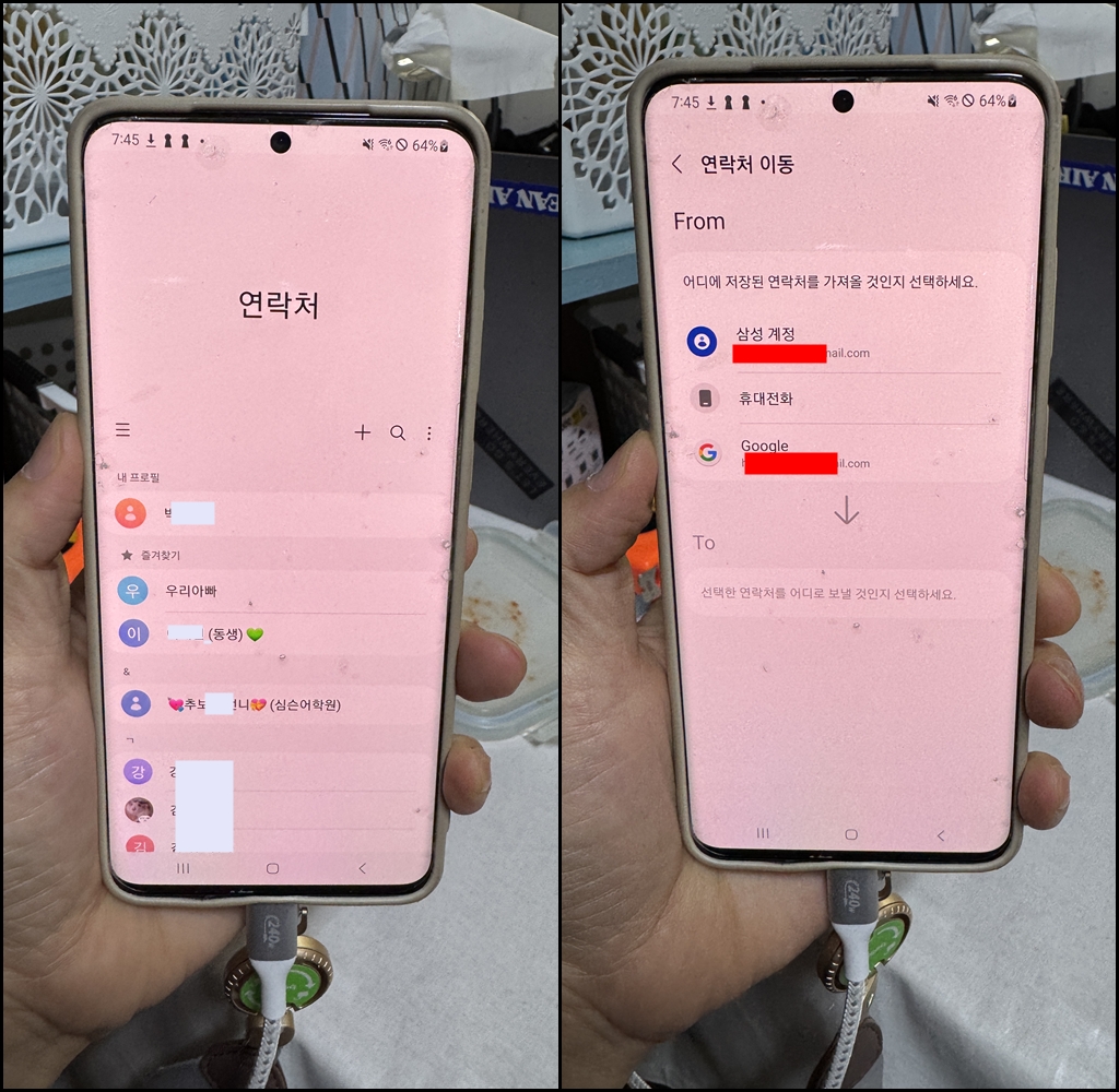 연락처 앱을 켜고 왼쪽 햄버거(삼선) 메뉴를 눌러 줍니다. 연락처 이동을 눌러서 각 계정을 눌러서 구글 계정으로 모아 줍니다.