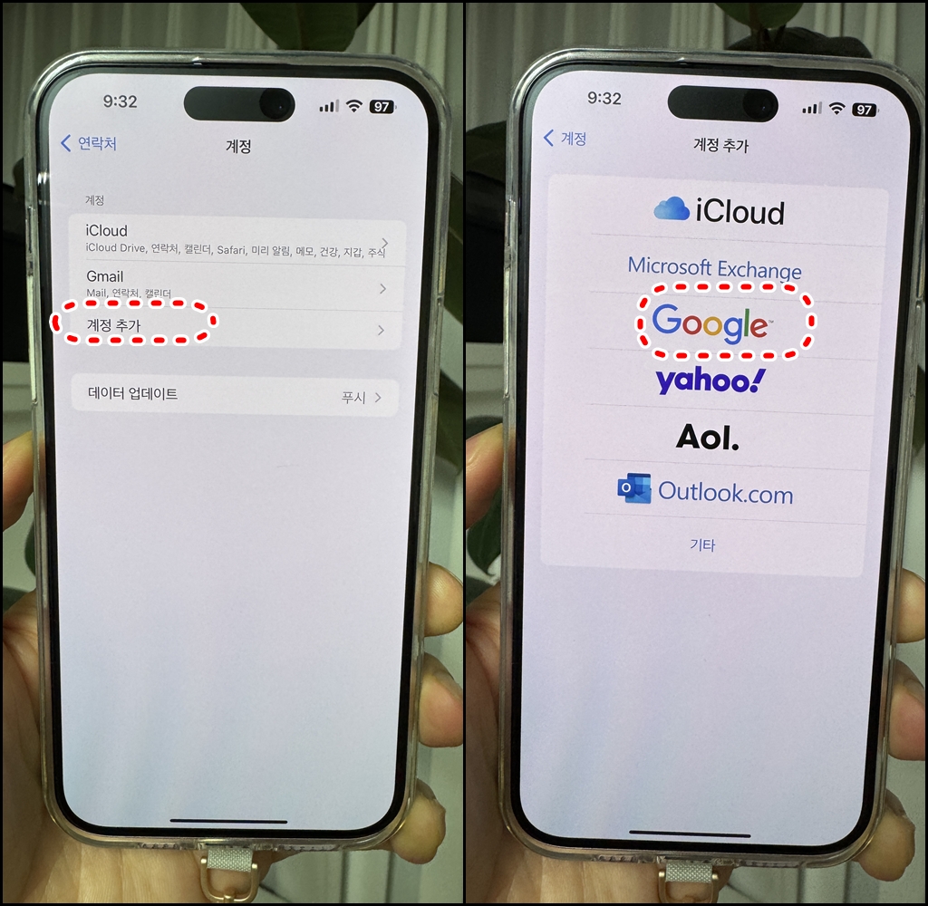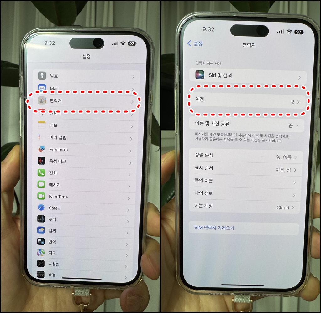 아이폰의 주소록 연락처 설정 생각보다 귀찮고 이상한데요. 애플 중심이라 계정을 연락처에도 추가해줘야 합니다.