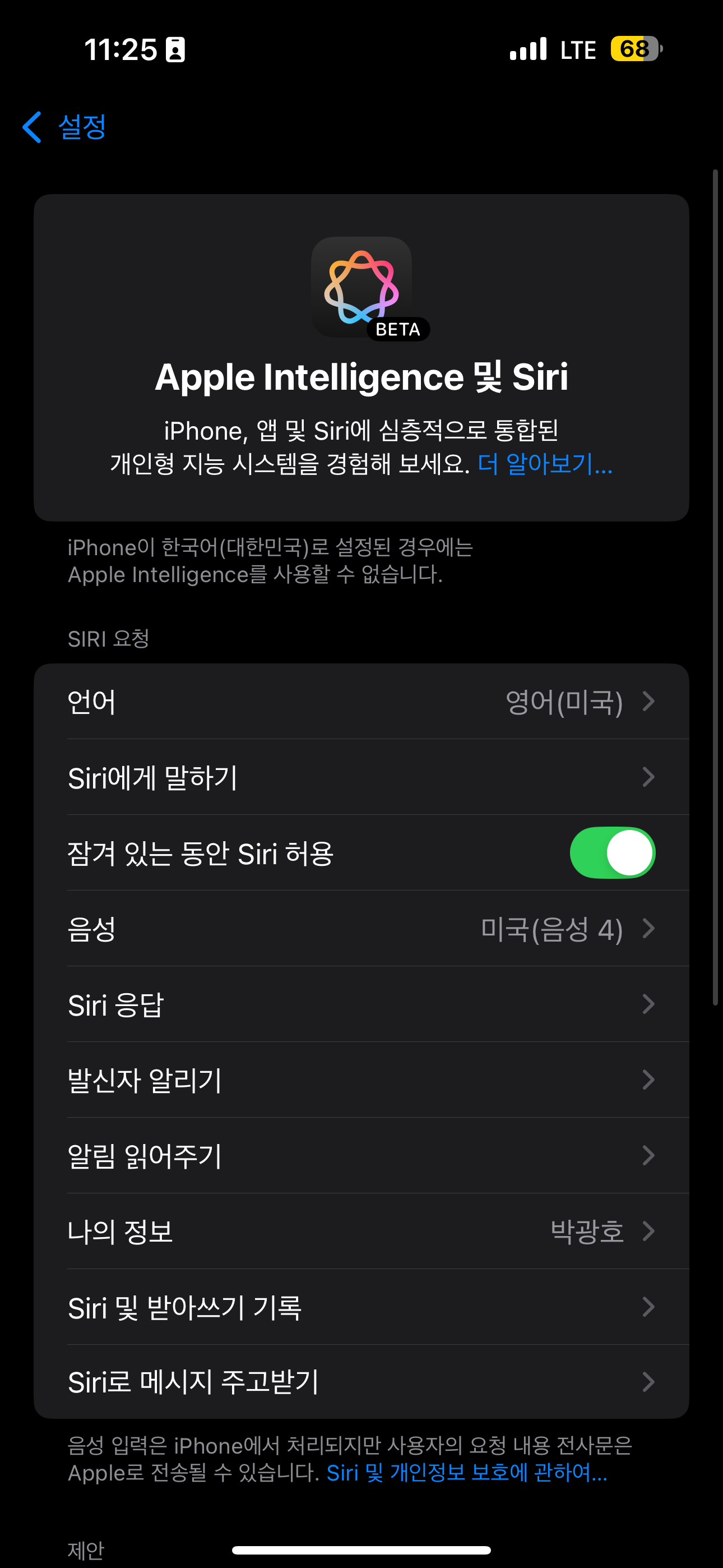 아이폰16을 산 이유가 애플의 인텔리젼스라면 베타로 언어와 지역을 영어로 설정하고 체험해보실 수 있습니다. 하지만 제약이 너무 크네요.