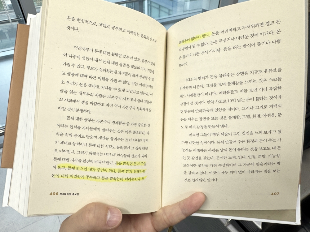 김승호 회장님은 돈을 인격체처럼 대하고 관리하는 법을 강조합니다. 이 책을 통해 배운 가장 중요한 교훈 중 하나는 돈을 단순한 물건이 아닌, 살아 있는 존재처럼 대할 때 더 나은 재정적 결실을 맺을 수 있다는 것입니다. 돈을 '좋은 친구'로 여기고, 이를 잘 대우하면 돈이 나를 떠나지 않고 내 곁에 머무른다는 메시지는 단순하지만 강력했습니다.
