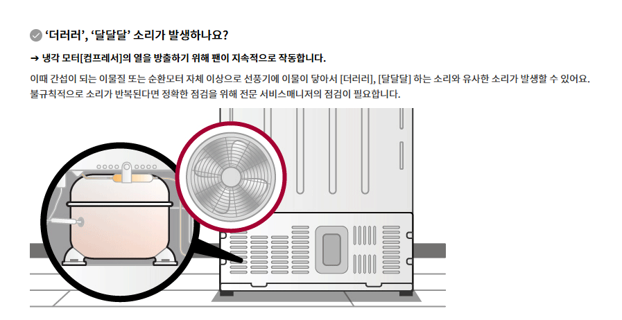 스스로 해결 : [LG 냉장고 소음] 작동 시 이상한 소음(드르륵, 웅, 웽, 다다닥)이 나요 | 고객지원 |