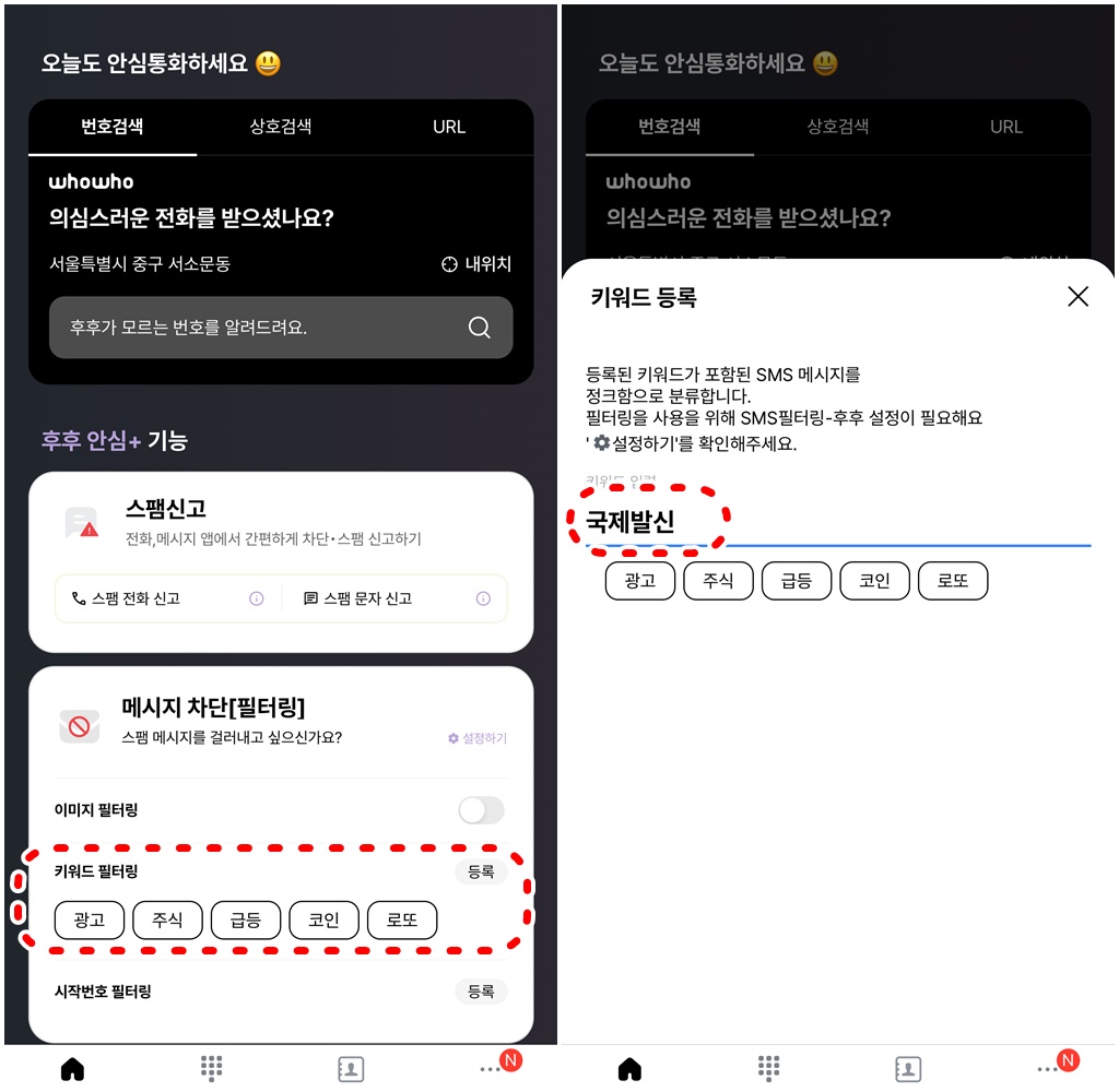 - 국제문자, me2.kr 같은 스팸 도메인을 추가해 차단 키워드를 설정하세요.